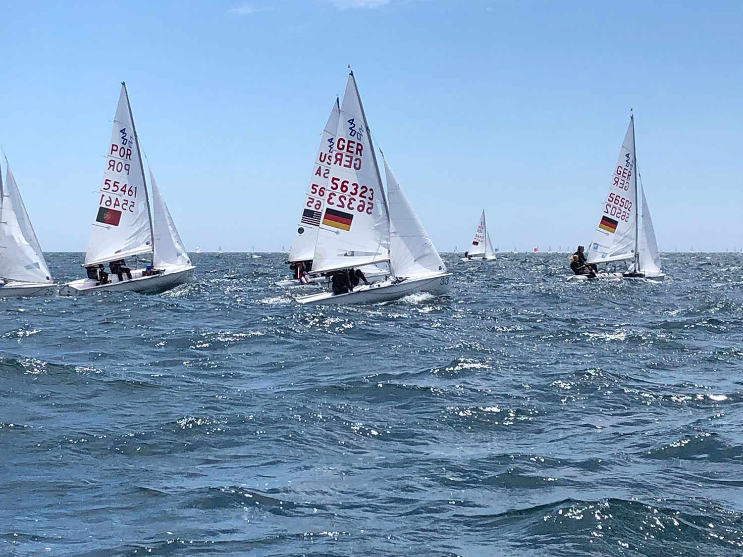 Bei  strahlendem Sonnenschein und frischen 19 Knoten Wind startete am Samstag 6.7. die 420er WM in Villamoura/Portugal mit 2 Wettfahrten auf zwei Regattafeldern. Etwas Verwirrung schaffte die Mitteilung an die Trainer, dass das U17 Feld auf beide Bahnen aufgeteilt wird.. Unser Trainer Daniel Zepuntke hat den Spagat seine 4 Teams auf 2 Feldern zu betreuen super hinbekommen. Leonie und Janne starten im Damenfeld, ein Team  Open ( Luis P./Maximilia N.) und die andere beiden Teams die Daniel betreut starten im U17 Feld (Florian K./Jannis S. und Cosima Sch./Paula Sch.).