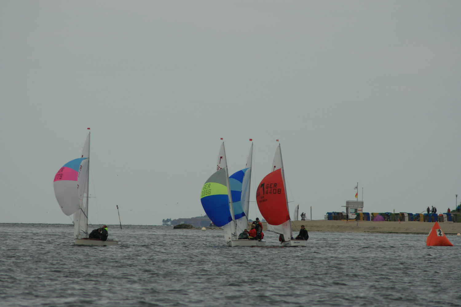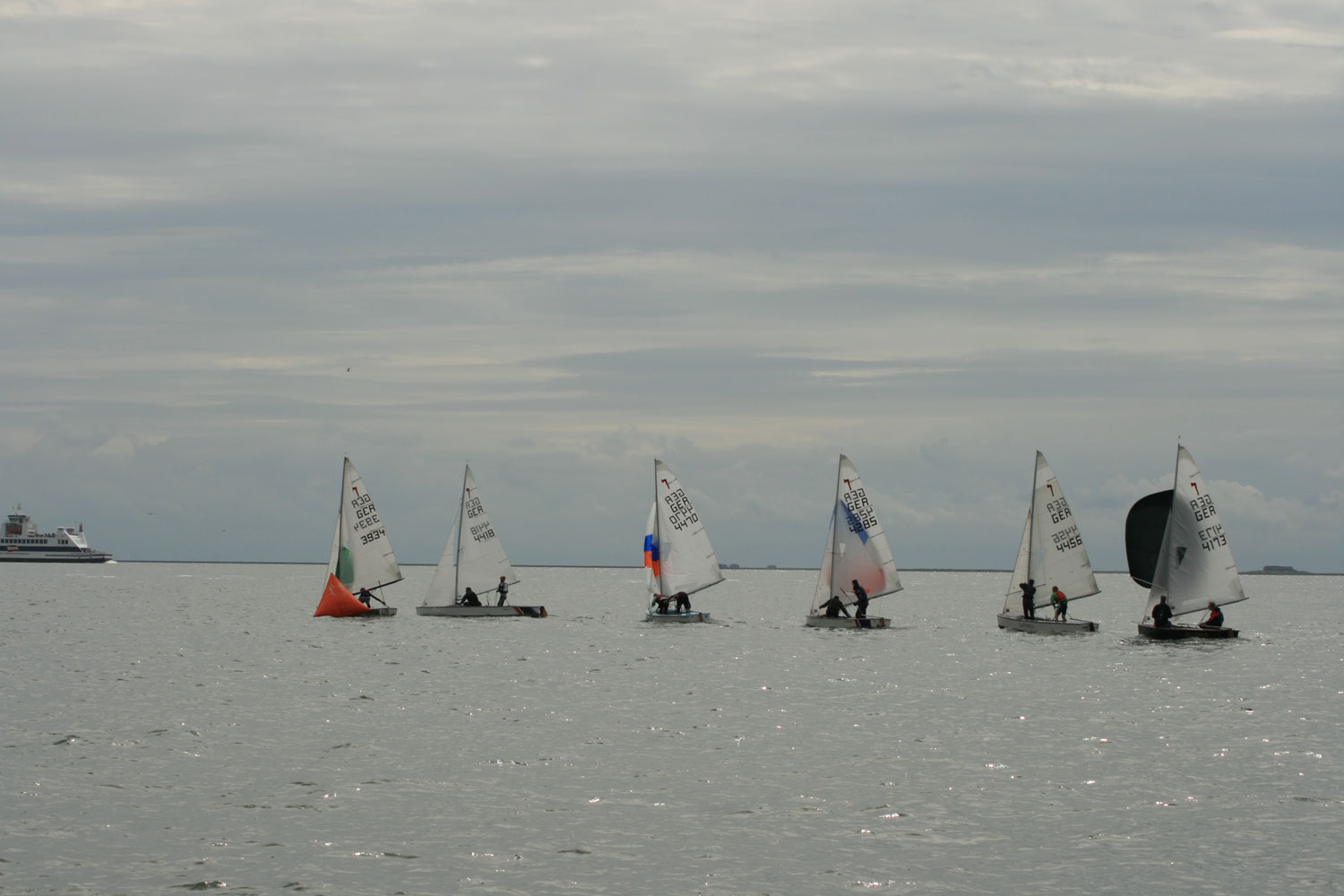 Am Sonntag verholten wir uns für die Wettfahrten bei deutlich aufgelockertem und sonnigem Himmel vor den Sandwall, der Touristenpromenade von Wyk. Dort konnten wir bei um die 10 Knoten drei schöne Wettfahrten werten, wenn auch mit teilweise drehigem Wind. Das war wieder das bekannte Segeln zum Anfassen, teilweise nur ca. 200 m vorm Strand. Für die Segler ist diese Ecke von Föhr jedoch aufgrund der nicht gerade geringen Strömung immer sehr anspruchsvoll.