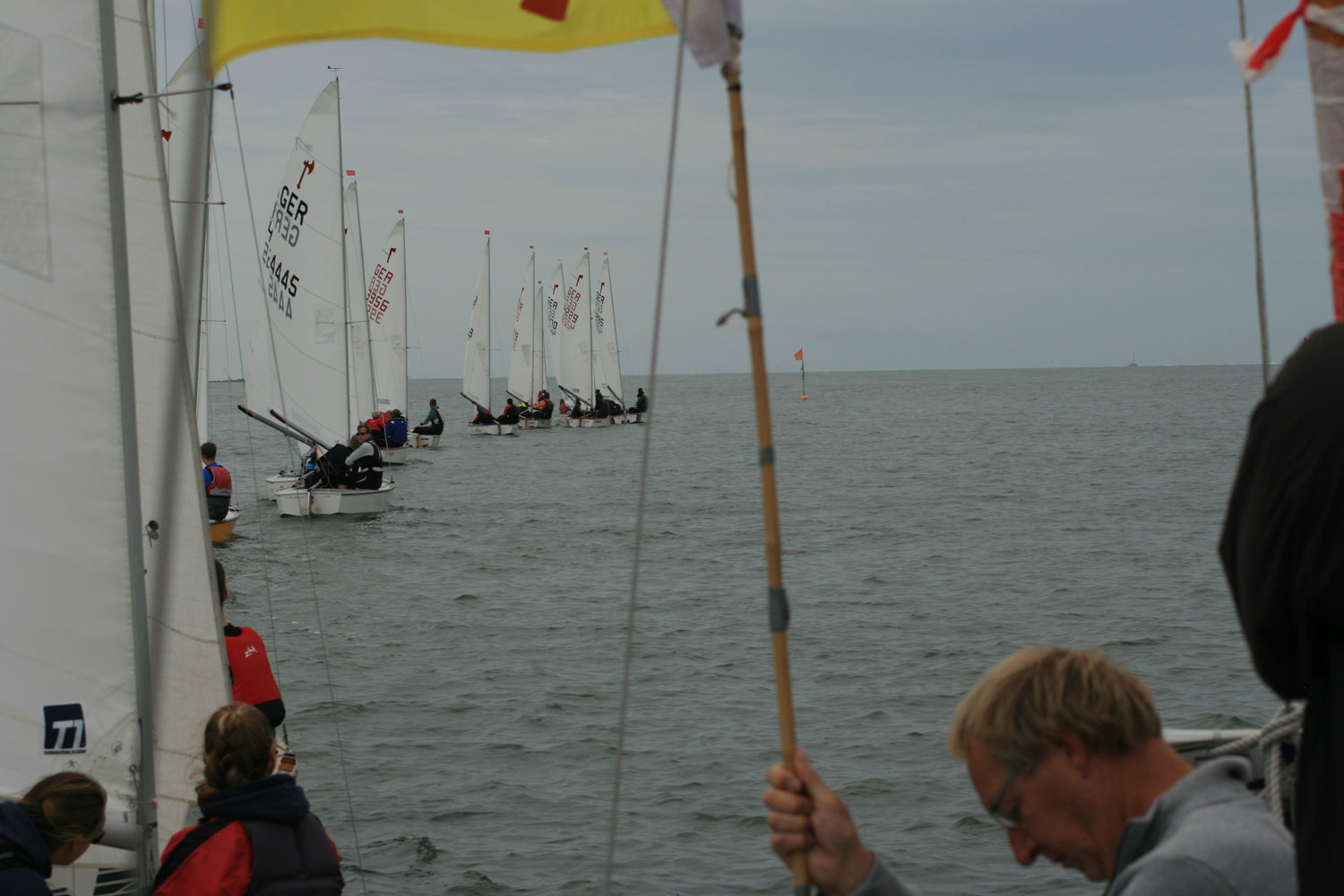 Nach einer für einige Teilnehmer kurzen Nacht begrüßte uns am Samstagmorgen leider etwas trübes Wetter mit um die 18 Knoten Wind sowie zeitweisen Schauern. Trotzdem konnten wir drei Wettfahrten nördlich vom Fährhafen vor „Klein Helgoland“ absolvieren. Zwar wäre gleich die erste Wettfahrt fast aus dem Zeitlimit gelaufen, aber eine lässige Bahnverkürzung rettete das Rennen. Nach der dritten Wettfahrt verdichtete sich dann das Wetter, so dass die Luvtonne zeitweise im Regen verschwand. Ein 70 Grad Dreher ergänzte das Ganze, der ein vollständiges und zeitaufwendiges Verlegen der Bahn zur Folge gehabt hätte. Damit wäre uns aber das Wasser zum Aufslippen der Boote am Strand weggelaufen. Mit „AP“ über „A“ ging es daher zurück an den Strand und an Land. Am Abend war dann traditionell Party beim Segelverein. Dass diese feuchtfröhlich war und nicht schon um 22:00 Uhr endete, ist für Föhr selbstverständlich. So manchem Segler war das am nächsten Morgen aber auch deutlich ansehen.