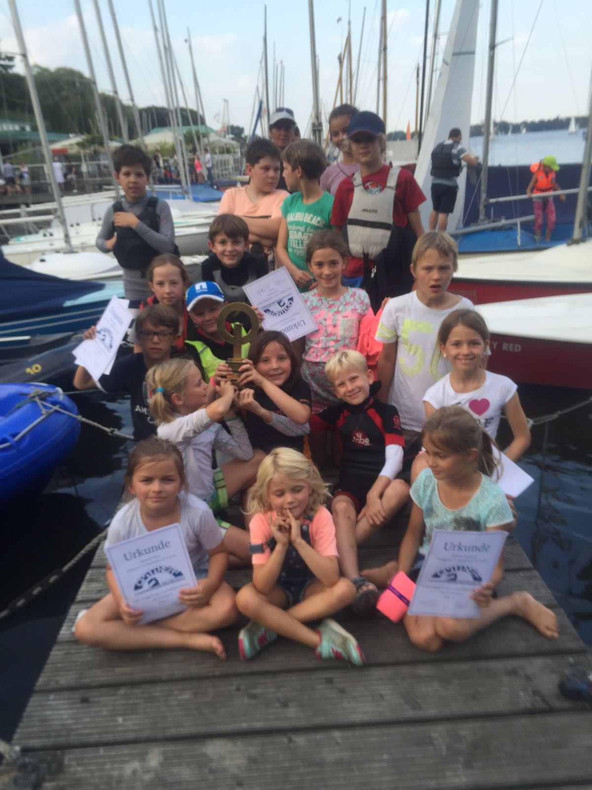 Als ich am Mittwoch erfahren habe, dass es einen Team Cup beim Alster Pokal gibt war ich doppelt aufgeregt: weil Ada, Svea & ich (Till. B) in den letzten Regatten gut waren & Alex uns in ein Team steckte. Am Samstag Morgen haben wir dann den Kuchen, den Svea & Ada als unsere Team-Anmeldung gebacken und super toll verziert haben, zur Anmeldung gebracht – es war ein echtes Meisterwerk geworden! Als wir aufs Wasser gingen war ich zum Glück nicht mehr so aufgeregt. Beim ersten Start bin ich ganz gut weg gekommen, bei Tonne 1 war ich dann 8. Bei der 2. Kreuz bin ich auf den 11 Platz gerutscht. Diesen Platz konnte ich dann ins Ziel retten. In der 2. Wettfahrt habe ich den Start völlig verkorkst. Auch beim Rest der Wettfahrt hatte ich kein Glück. In der 3. Wettfahrt habe ich nochmal ein richtig gutes Rennen hingelegt & wurde 5. Bei der Siegerehrung wurde ich dann als 9. aufgerufen und habe ein Mikrofaser Handtuch gewonnen. Danach wurde noch zum Team Preis aufgerufen: Ada (12.), Svea (22.) & ich haben den Team Cup gewonnen!