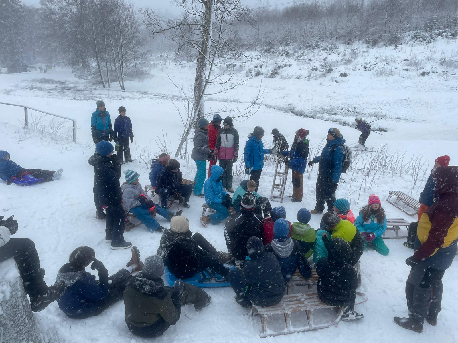 Am Freitag ging es direkt auf die Langlaufloipe in Schierke. Die allermeisten von uns standen zum ersten Mal auf Langlaufskiern. Nach einer Einführung in Technik und Praxis von Svenja und Toni haben sich aber schon am ersten Tag alle ganz gut geschlagen, das Gleichgewicht auf den Skiern zu finden und die erste größere Runde zu drehen. Nach einem Einkehrschwung bei Kakao, belegten Brötchen und heißen Würstchen beim „Brockenbäcker“ haben wir den Nachmittag beim Schlittenfahren auf dem Wurmberg verbracht. Nach einem langen Aufstieg gab heiße Schlittenrennen den Berg herunter und eine wilde Schneeballschlacht. Abends wurde in der Jugendherberge Wernigerode von uns die Kegelbahn und die Tischtennisplatten belagert.
