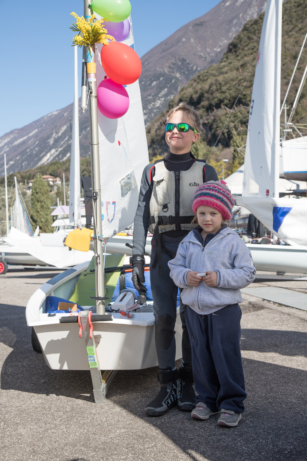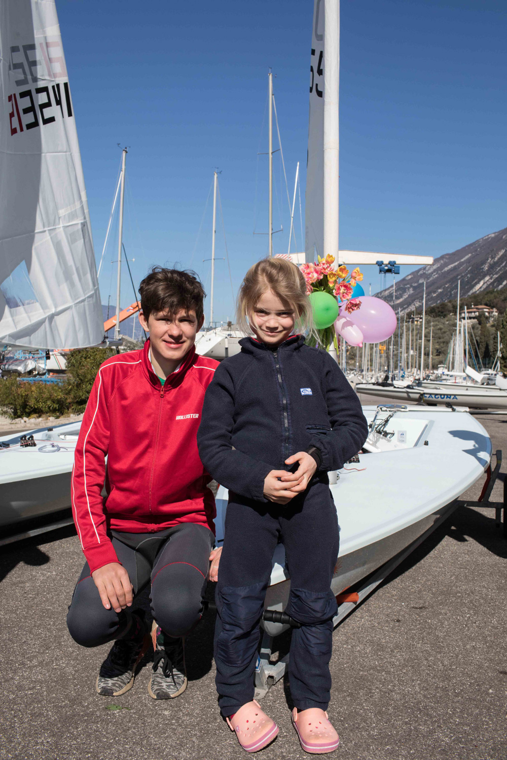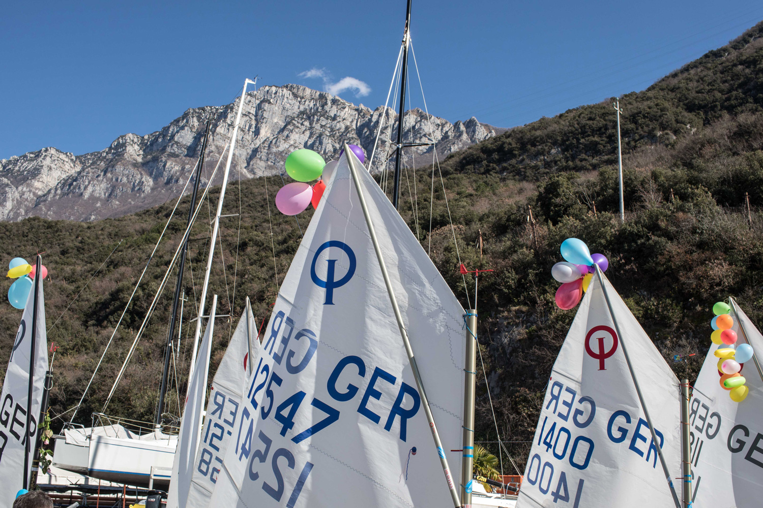 Bei strahlendem Sonnenschein und einer fast zu leichten Brise wurden heute nach dem obligatorischen Massenbild der gesamten MSC Entourage mit großem Clubstander neun Boote getauft. Vor allem die sechs Optimisten waren üppig mit Blumen und Luftballons geschmückt, die beiden Laser und 420er, die ebenfalls neue Namen erhielten, stylten sich eher getreu der Maxime „weniger ist mehr“. Die Namen gaben allerlei Anlass zu Spekulationen und lustigen Gedanken: Till befindet sich nun beim Segeln gedanklich auf „Wolke 7“, Esther segelt schneller als der Blitz, auch wenn man schon französisch parlieren sollte, um „Foudre“ richtig zu übersetzen. „Showtime“ ist nun bei Svea angesagt, während Tristen mit „Andiamo“ drängelt, schnell wieder aufs Wasser zu kommen. Jan entschied sich für die numerische Lösung und segelt nun „Iskareen XIII“. Die 420er Segler Marvin und Jesper machten den am häufigsten an Bord gebrauchten Satz „Halt mal eben“ zum Namen ihres Bootes, während sich Emil und Max für eine segelnde „Wohngemeinschaft“ entschieden. Die beiden Neuzugänge in der Laserflotte heißen „Yellow Ribbon“ und „ ja gleich“ und werden von Jonas und Paul gesegelt. Nach der Taufe ging es mit den bis über Sprit und Mastspitze mit Luftballons verzierten Booten direkt zum Training aufs Wasser – auf dass mit dem programmgemäß einsetzenden Ora die Dekoration abgesegelt wird.