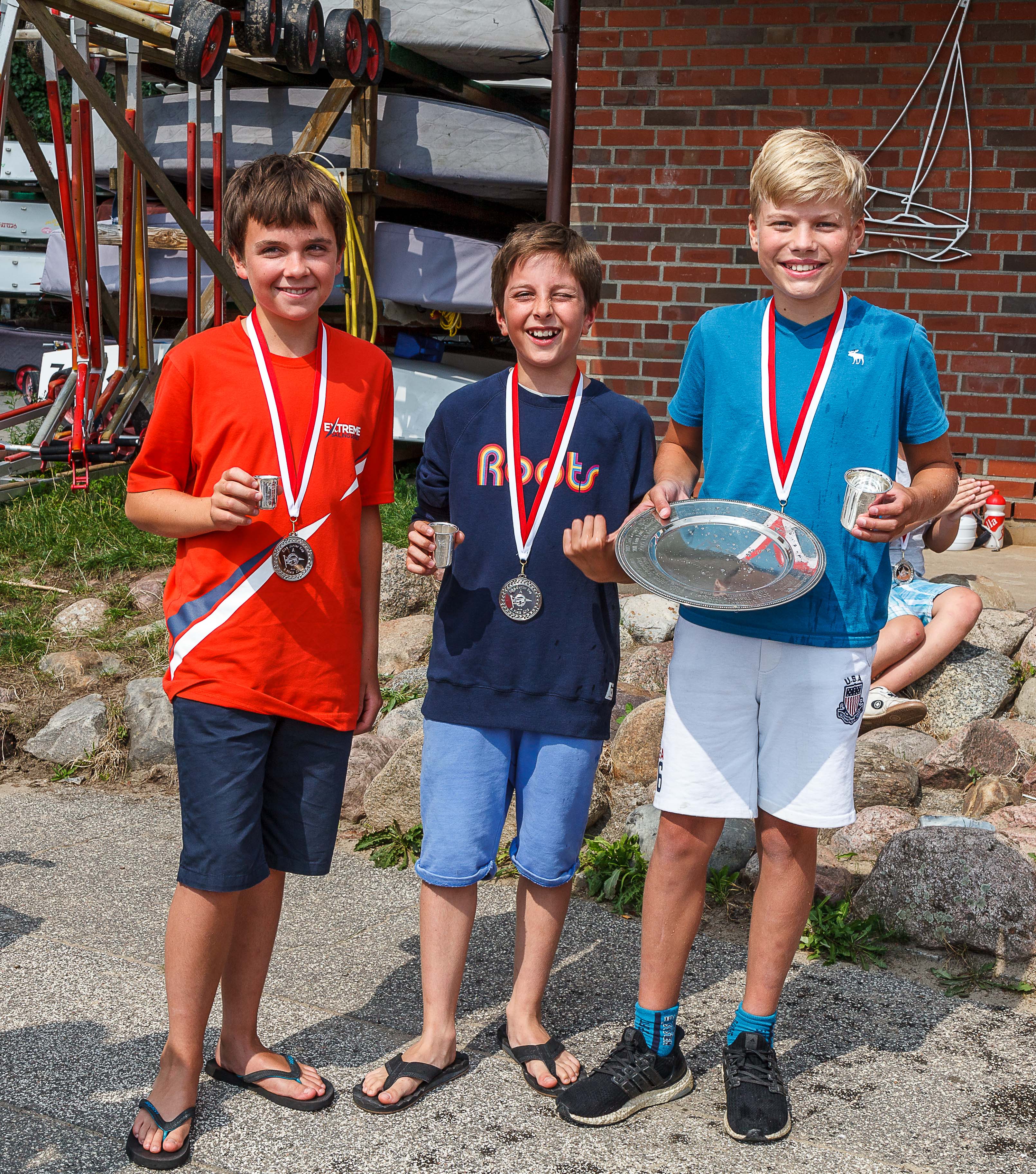 Während auf dem B-Treppchen nur die Plätze getauscht wurden – am Ende Esther vor Lea Sophie und Jan-Phillip, konnte sich bei den Opti A Max noch auf Platz 3 hoch kämpfen. Vor ihm tauschtn Henrik (Platz 1) und Lysannder (Platz 2) noch die Plätze.