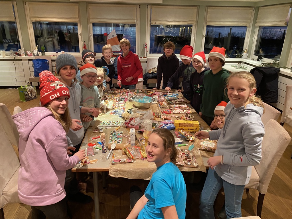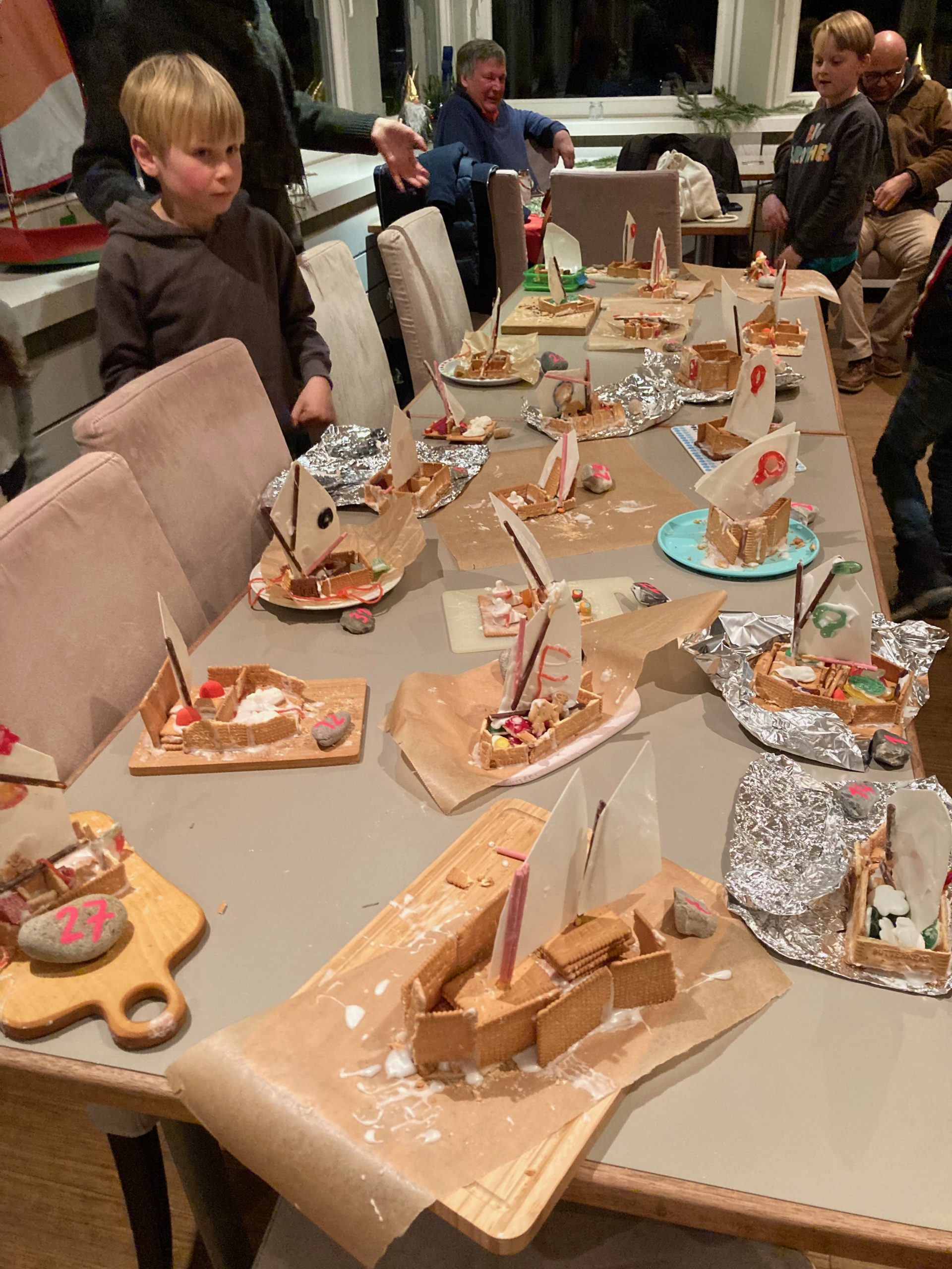 Bei den A’s und B’s wurde verziert und gekleistert was das Zeug hält. Entstehen sollten 2 MSC Clubhäuser aus Lebkuchenplatten, in freier und teilweise futuristisch angehauchter Interpretation wurde das von den rund 40 Kindern toll umgesetzt. Nicht alle Süßigkeiten wurden als Deko verwendet, einige wanderten auch direkt in den Magen und wurden dort noch von leckeren Waffeln aus der Gastronomie ergänzt. Beim Segel Activity konnten die A’s glänzen, in der Hausbauarbeit hatten die B’s die Nase vorn.