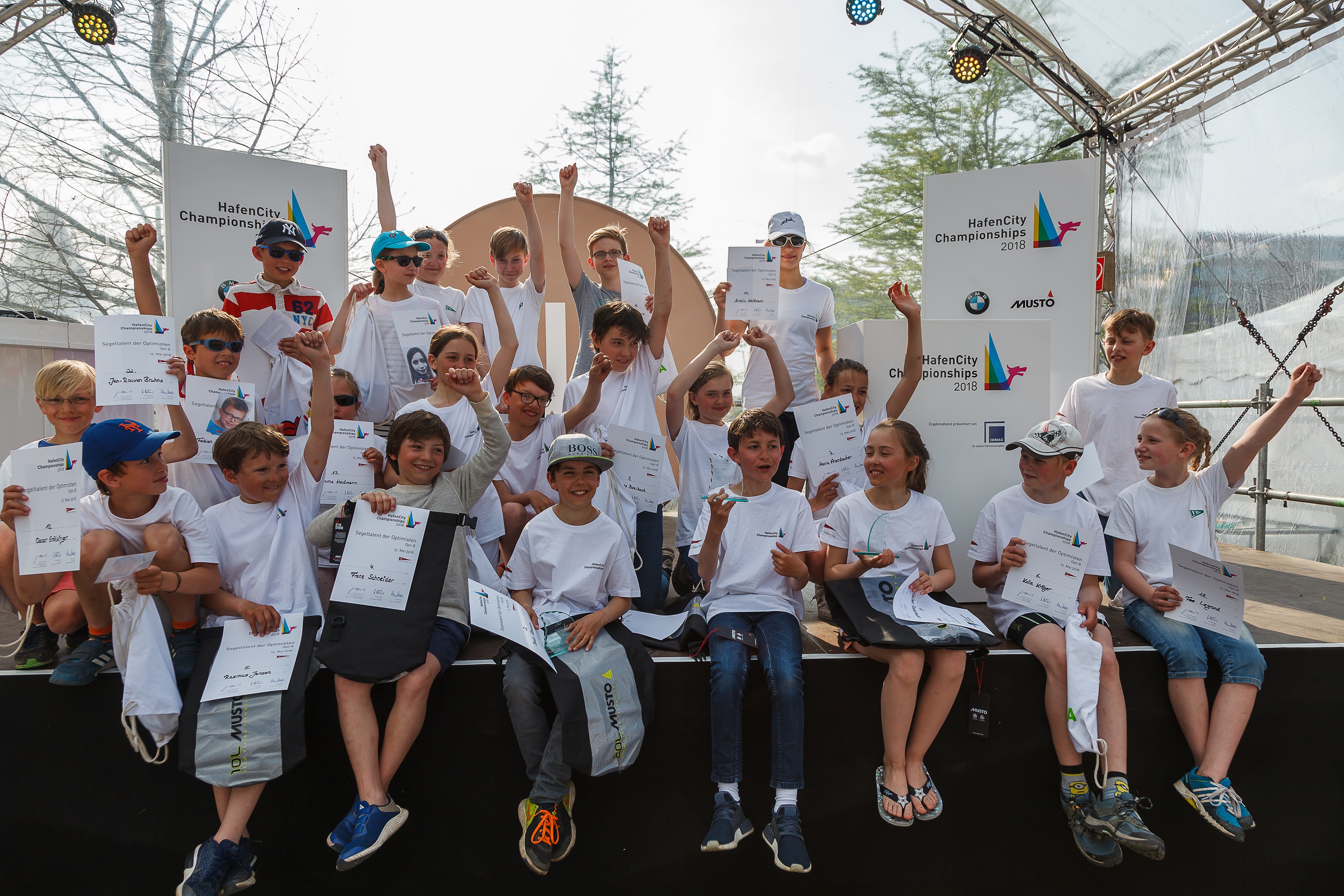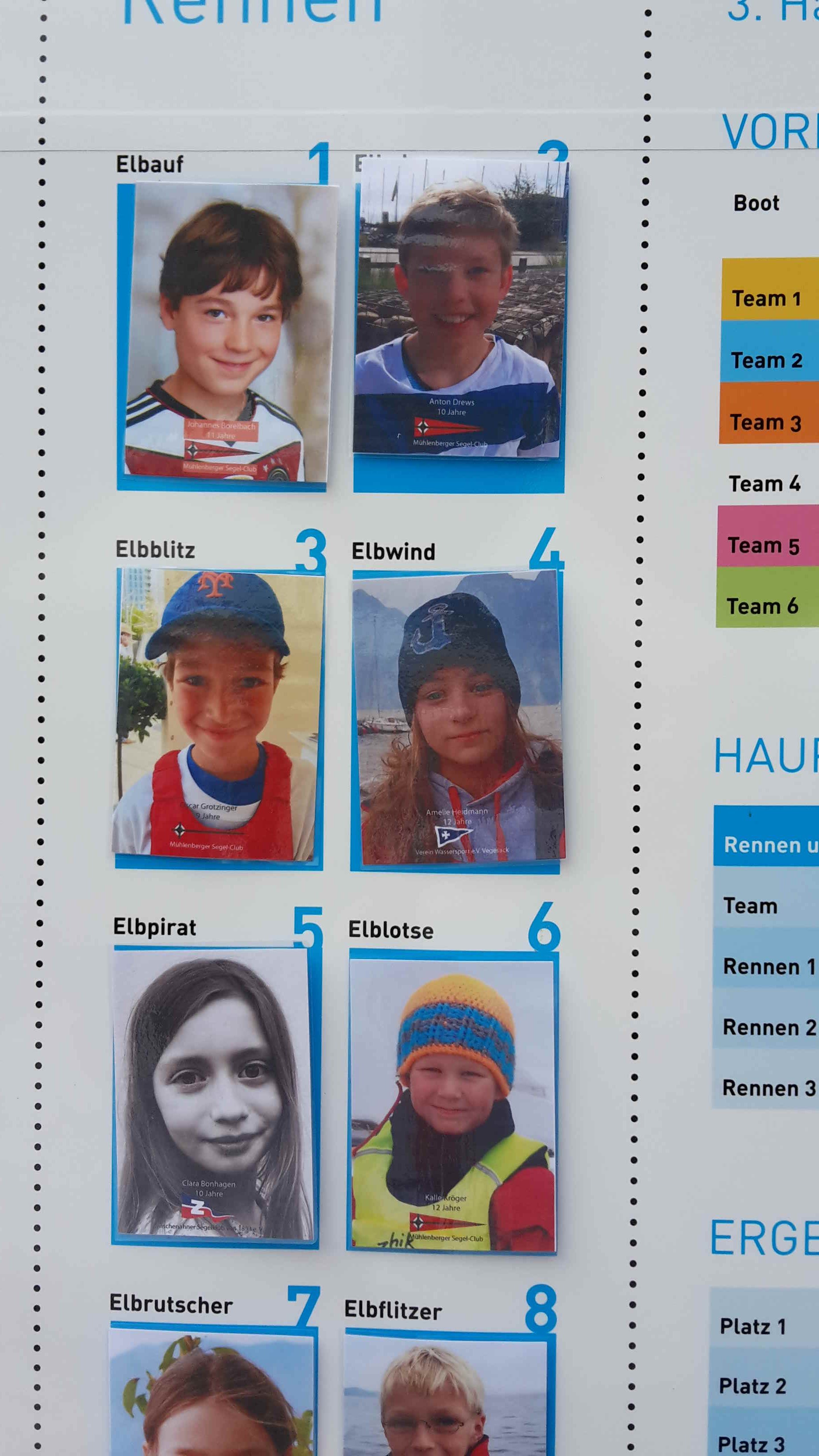 Mehr Wind erwartete die Segler am Sonntag zur dritten Auflage der Hamburger Meisterschaft im Teamsegeln, gleichzeitig ein Wertungslauf für den German Team Cup 2018. Sechs Teams mit 4 Kindern segelten in der Vorrunde jeweils einmal jeder gegen jeden. In den Wettfahrtpausen erholten sich die Nachwuchsskipper an Land bei Eis und kühlem Fußbad, hatten aber auch die Möglichkeit, die Rennen der anderen Gruppen hautnah vom Schlauchboot aus zu verfolgen. Die Zuschauer sahen knappe Rennen und eine tolle Vorstellung aller Teams, die jüngsten Teilnehmer waren gerade einmal 8 Jahre alt. Durch die wirklich gute Moderation konnten auch Segellaien so richtig mitfiebern und es gab viel Applaus für die jeweiligen Sieger und tolle taktische Aktionen von den Zuschauern im Grasbrookhafen. Auch der Wirtschaftssenator Hamburgs, Herr Horch, ließ es sich nicht nehmen, vorbei zu gucken und ein Rennen anzuschießen. In einem spannenden Finale setzte sich das weiße Team gegen das Team flower Power durch und Jonas Mager, Caspar Ilgenstein, Till Bergmann und Paul Porthun konnten nicht nur stolz die Siegerpokale entgegen nehmen sondern auch wichtige Punkte für den German Team Cup verbuchen.