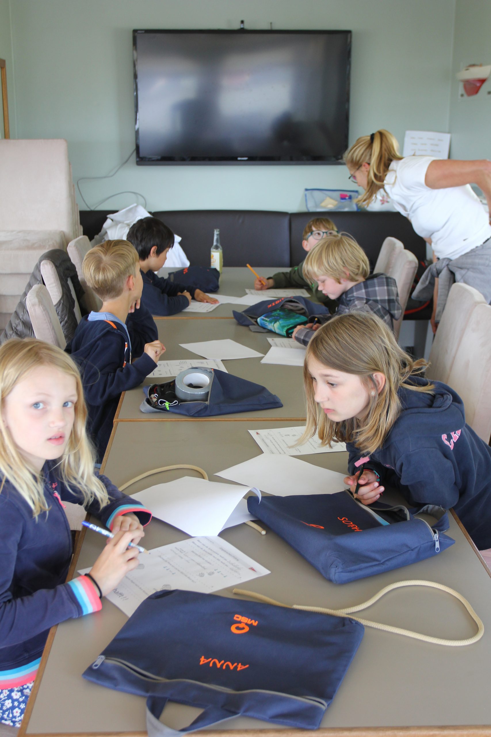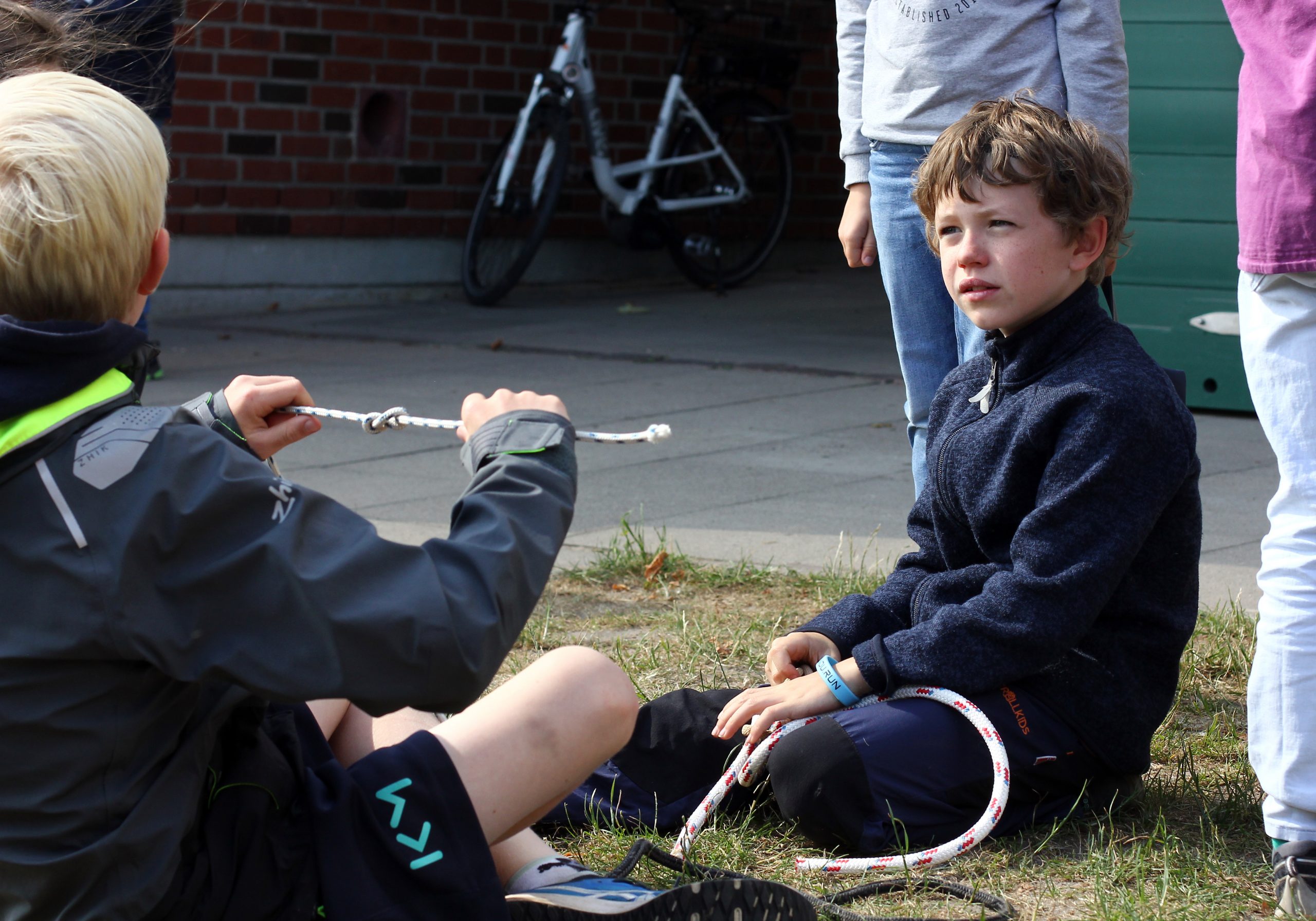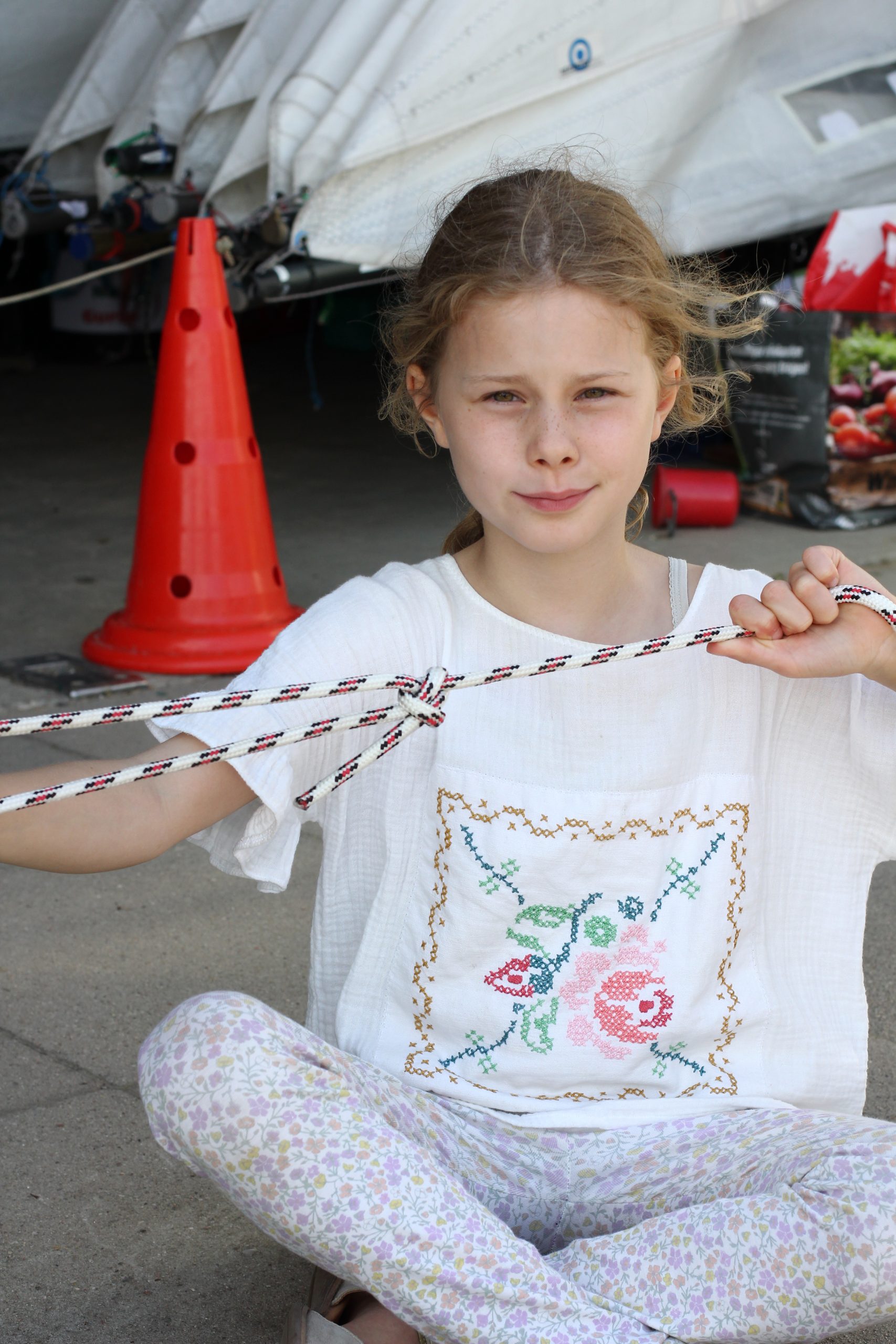 Dass alle Kinder ein Dreieck absegeln und sowohl Wende als auch Halse fast schon wie im Schlaf beherrschen, hatten sie im Training vorher schon bewiesen. Jetzt musste nur noch die Knotenprüfung bei Sabine bestanden und der Theorietest gemeistert werden.