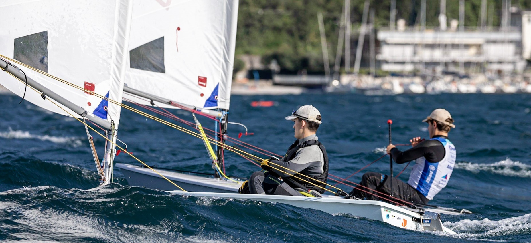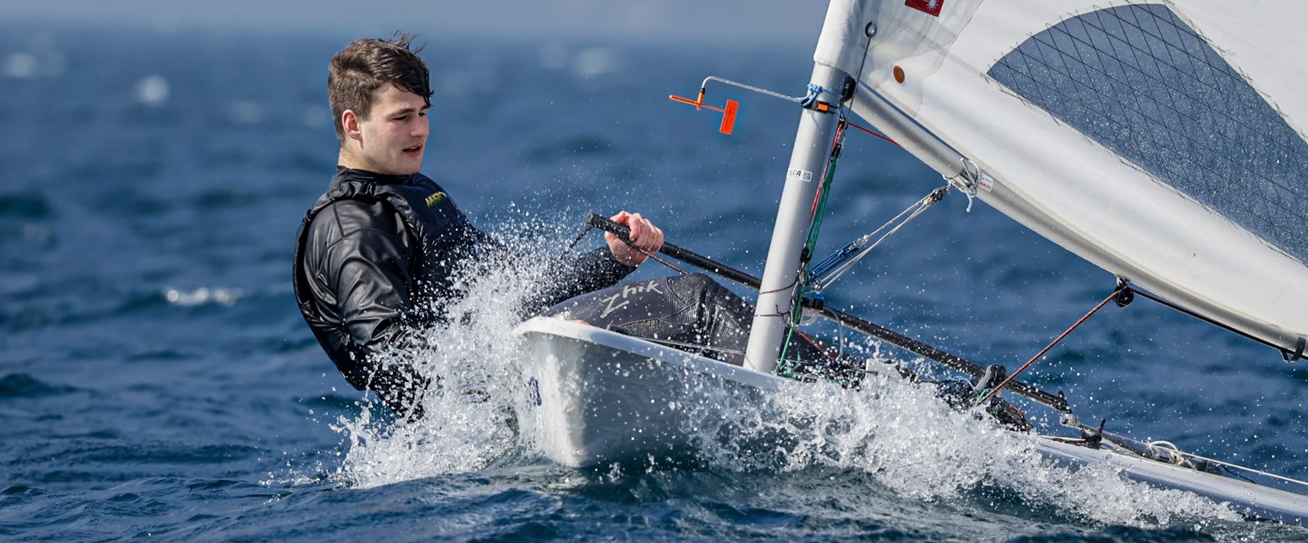 Der ILCA 7 hat tatsächlich ziemlich genau 7 m² Segelfläche und ist seit 1996 im olympischen Programm. Zunächst offen für beide Geschlechter, haben sich bei einem Idealgewicht von soliden 80 kg doch die Männer etabliert in der Klasse. Zu erkennen ist das Segel an den weißen Ecken und dem großen Fenster.