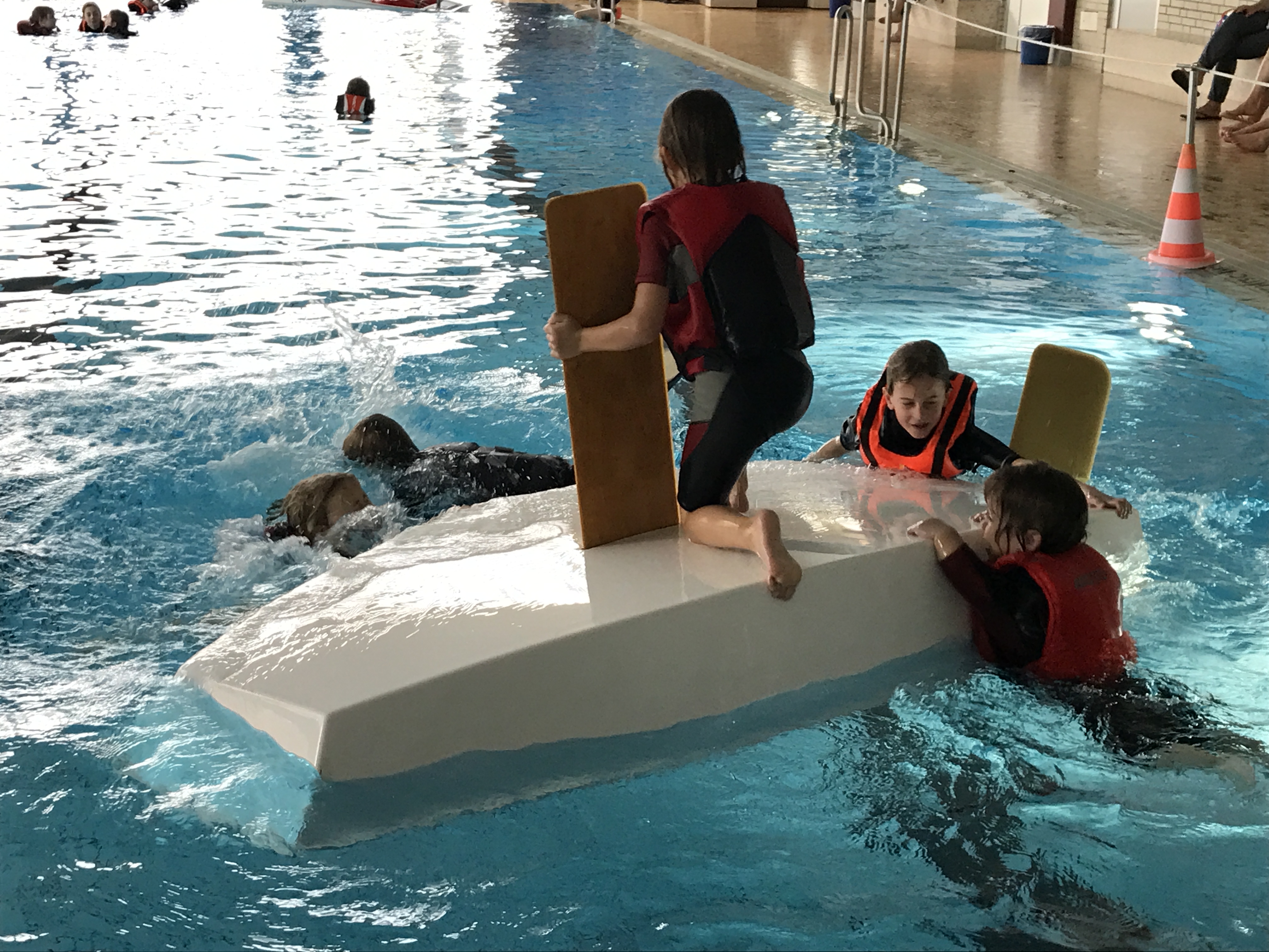 An vier Optis konnten die Kinder mit viel Spaß das Kentern, Aufrichten und Leerpützen üben. Dabei sammelten sie viele neue Erfahrungen, z.B. so schnell kippt der Opti doch nicht um und unter dem durchgekenterten Opti ist eine Luftblase. Zum Abschluss gab es noch zwei Wettkämpfe: Opti aufrichten – leerpützen und um eine Tonne paddeln.