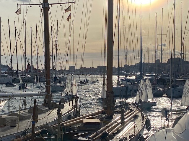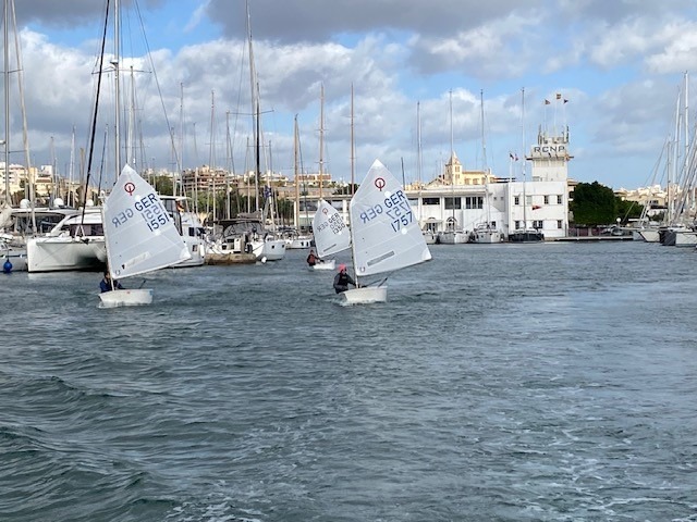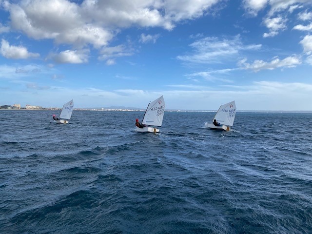Bei wechselhaften Bedingungen aber schönstem und warmem Wetter trainierten wir in unserer kleinen Gruppe zunächst vor der einzigartigen Kulisse von Palma. An Land wurde es voller und voller und am Ende konnte man morgens kaum noch einen Weg durch die über 300 Optis über das Gelände des ehrwürdigen RCNP („Real Club Nautico de Palma“) finden. Teilnehmer aus aller Welt fanden sich zu diesem perfekt organisierten Event ein.