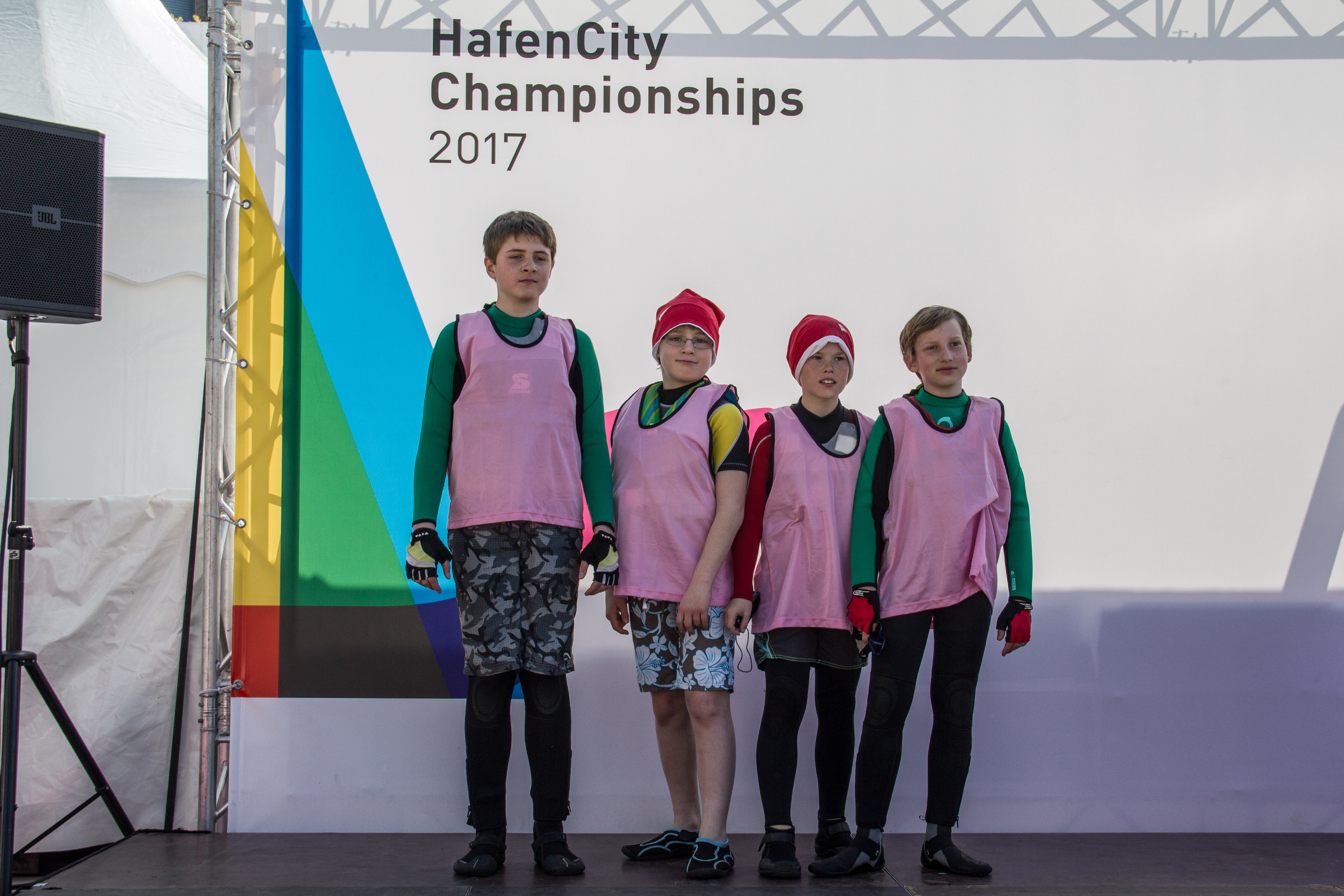 Die Siegerehrungen auf großer Bühne waren ganz nach dem Geschmack der vielen Sieger/-innen. Es gab praktische Geschenke und schöne Pokale. Der Pokal für den Hamburger Meister wurde von Immac gestiftet, der an das MSC 1 Team ging. Das Siegerteam des German Team Cups/2. Hamburger Team Race-Meisterschaft nahm den Pokal in Form des Grasbrookhafens aus 5 Holz-Puzzleteilen mit nach Berlin.