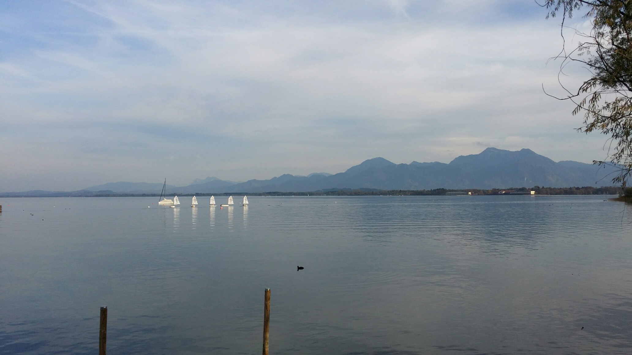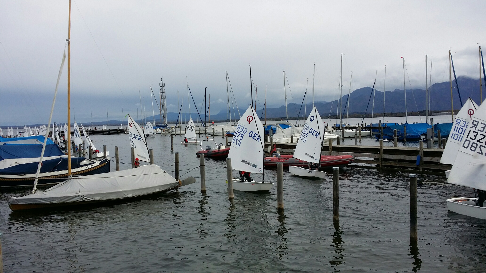Am Sonntagmorgen regnete es, aber dafür gab es eine leichte Brise. Ab 8.00 Uhr wurden die Boote zu Wasser gelassen und pünktlich um 9.00 Uhr wurde das erste Rennen angepfiffen. Vier Wettfahrten wurden zunächst bei Regen, dann aber bei etwas Sonnenschein und aufflackernden Winden gesegelt. Großes Lob an die Veranstalter: mit Obstschalen, Brezeln und leckerem Spagetti Bolognese und Kürbissuppe wurde für das leibliche Wohl der jungen Segler/innen gesorgt. Absoluter Luxus waren die beheizten Umkleidezelte, die für diese Veranstaltung aufgebaut worden waren. Am Freitagnachmittag hatten die vier Segler Caspar, Jonas, Kajus und Theodor ihre erste Trainingseinheit mit Michael. Michael war es ohnehin zu verdanken, dass die Opti-Boote und die Segler rechtzeitig an den Chiemsee kamen. Nachdem der MSC Bus in Kassel mit einem kapitalen Turboladerschaden liegen geblieben war, nahm Michael den Zehner-Trailer an den Haken und Jonas und Kajus mit an Bord.