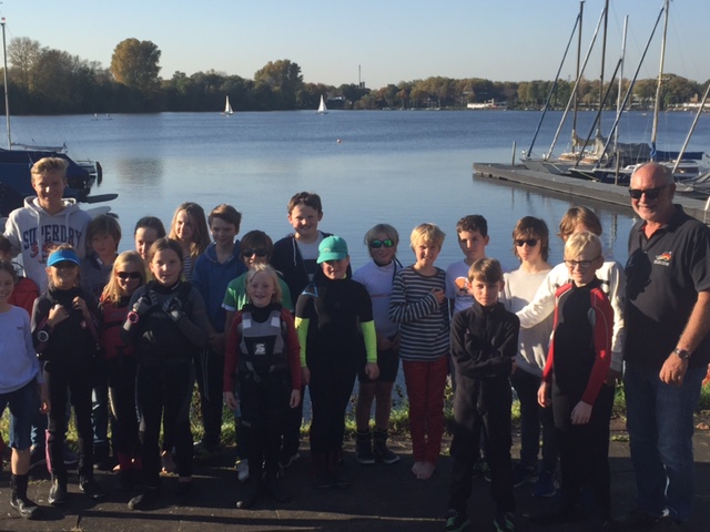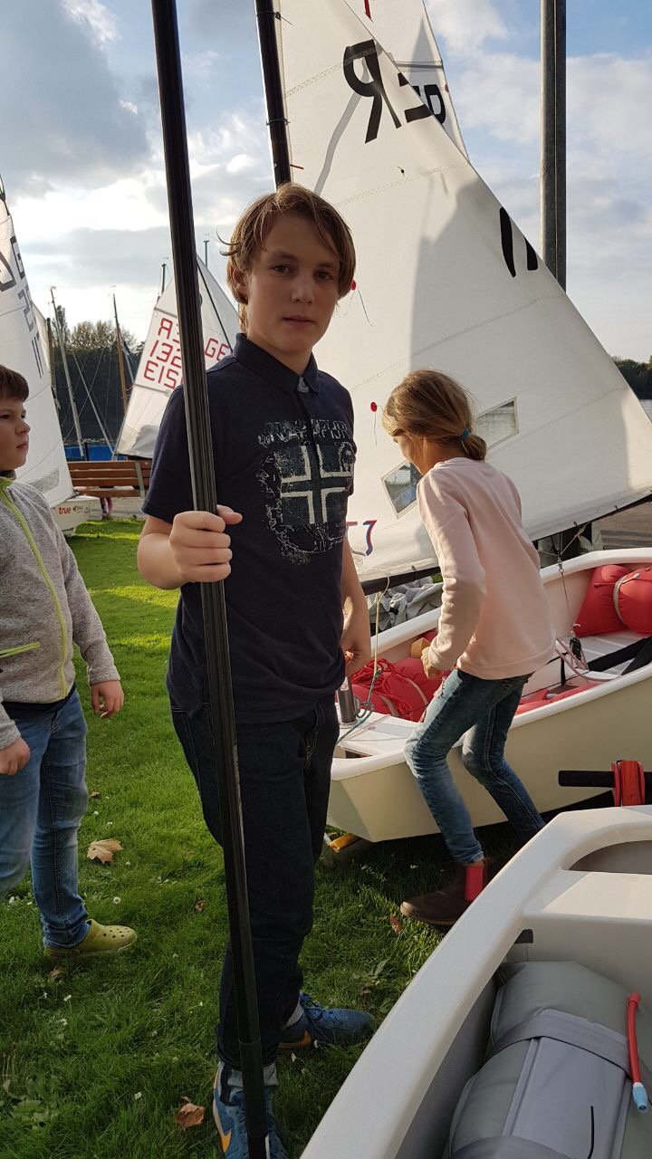 Am späten Nachmittag wurden sie von Gerd Eiermann und seinem Co-Trainer Nils Sternberg (Opti-Vizeweltmeister 2014 und Trainer bei der Europameisterschaft 2017) begrüßt. Die Boote wurden abgeladen, aufgebaut und die Segel aufgeriggt und getrimmt. Erste Tipps der Trainer wurden aufgesogen. Um 19:00 Uhr gab es im Clubhaus ein gemeinschaftliches Essen, bevor wir mit allen Kindern in die Jugendherberge starteten. Die Jugendherberge befindet sich im Sportpark direkt gegenüber dem Fußballstadion des MSV Duisburg, und natürlich gab es an diesem Abend ein Fußballspiel, und natürlich war das Spiel genau zu der Zeit zu Ende, als wir uns unserer Unterkunft näherten. Dementsprechend dauerte es, bis wir die nur 4 km durch blau gekleidete Menschenmassen überwunden hatten. In der Jugendherberge konnte Susi Sternberg, Mutter von Nils und Betreuerin der Kinder für dieses Wochenende, schnell die Zimmereinteilung vornehmen, so dass die müden und immer noch aufgeregten Kinder schnell ins Bett konnten.