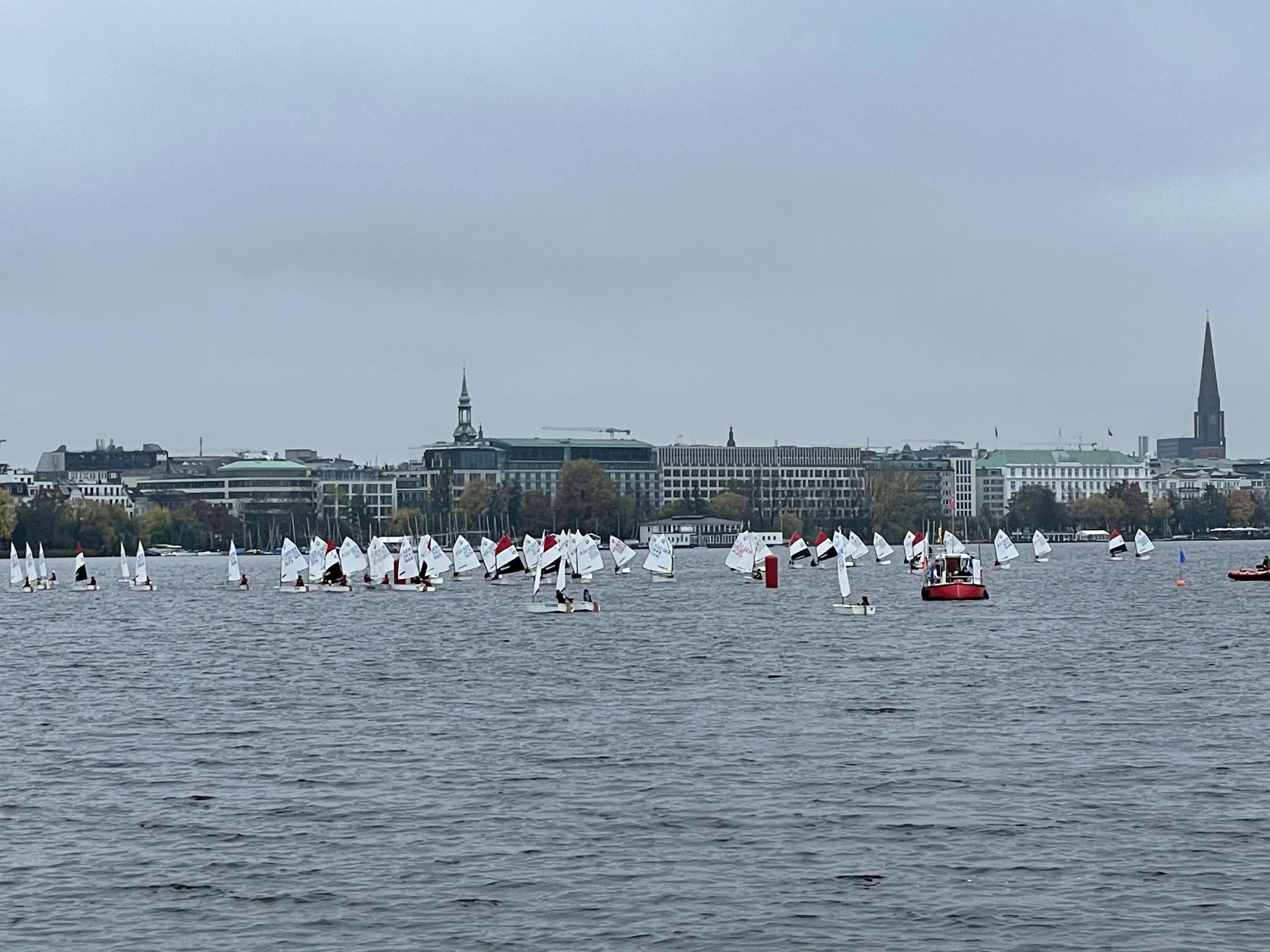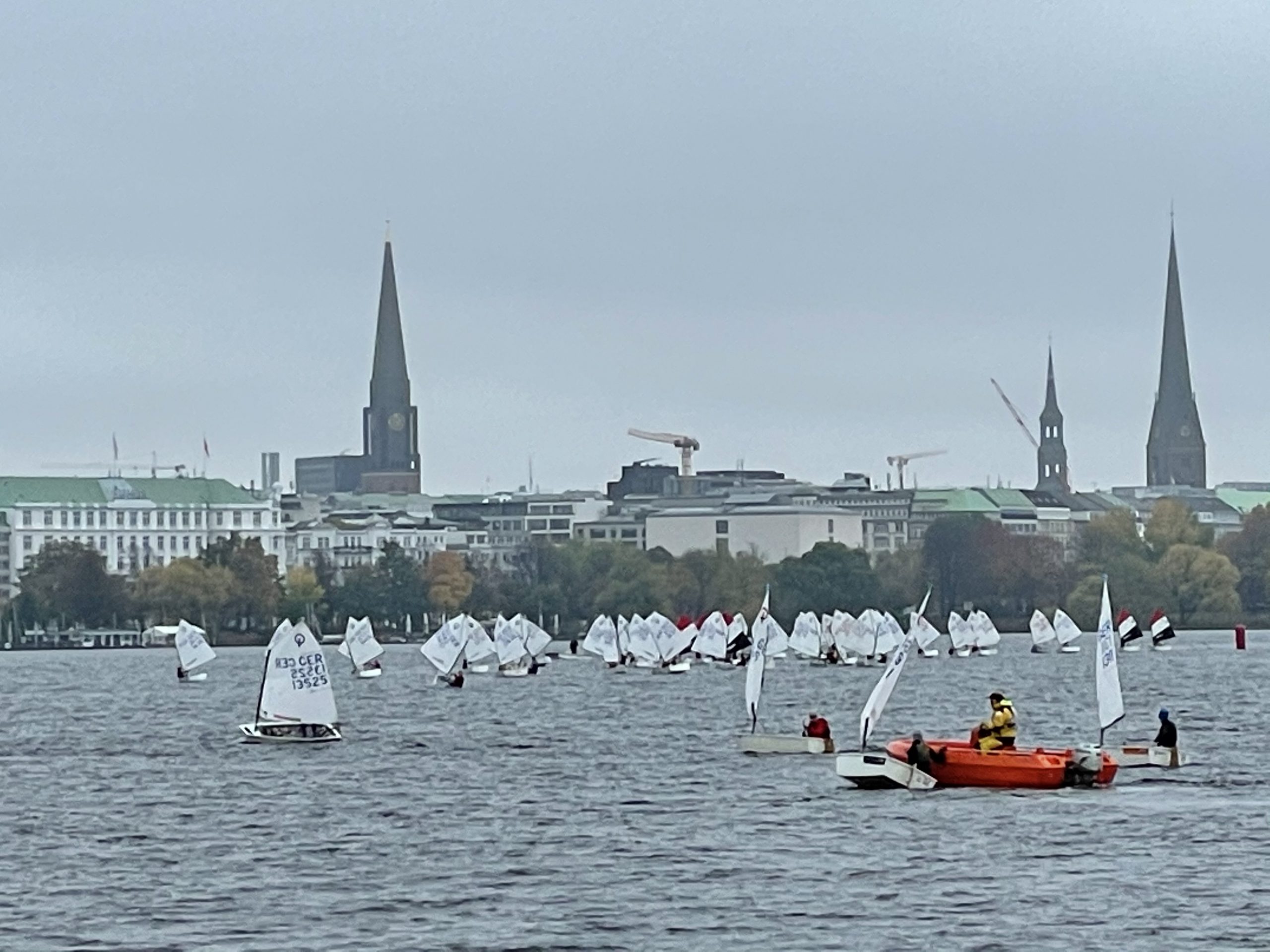 Mit enormem Aufwand und unter strengen Hygieneregeln konnte die Regatta dann doch am 31.10 und 1.11. mit 26 Opti A und 54 Opti B Kindern auf der Alster stattfinden.