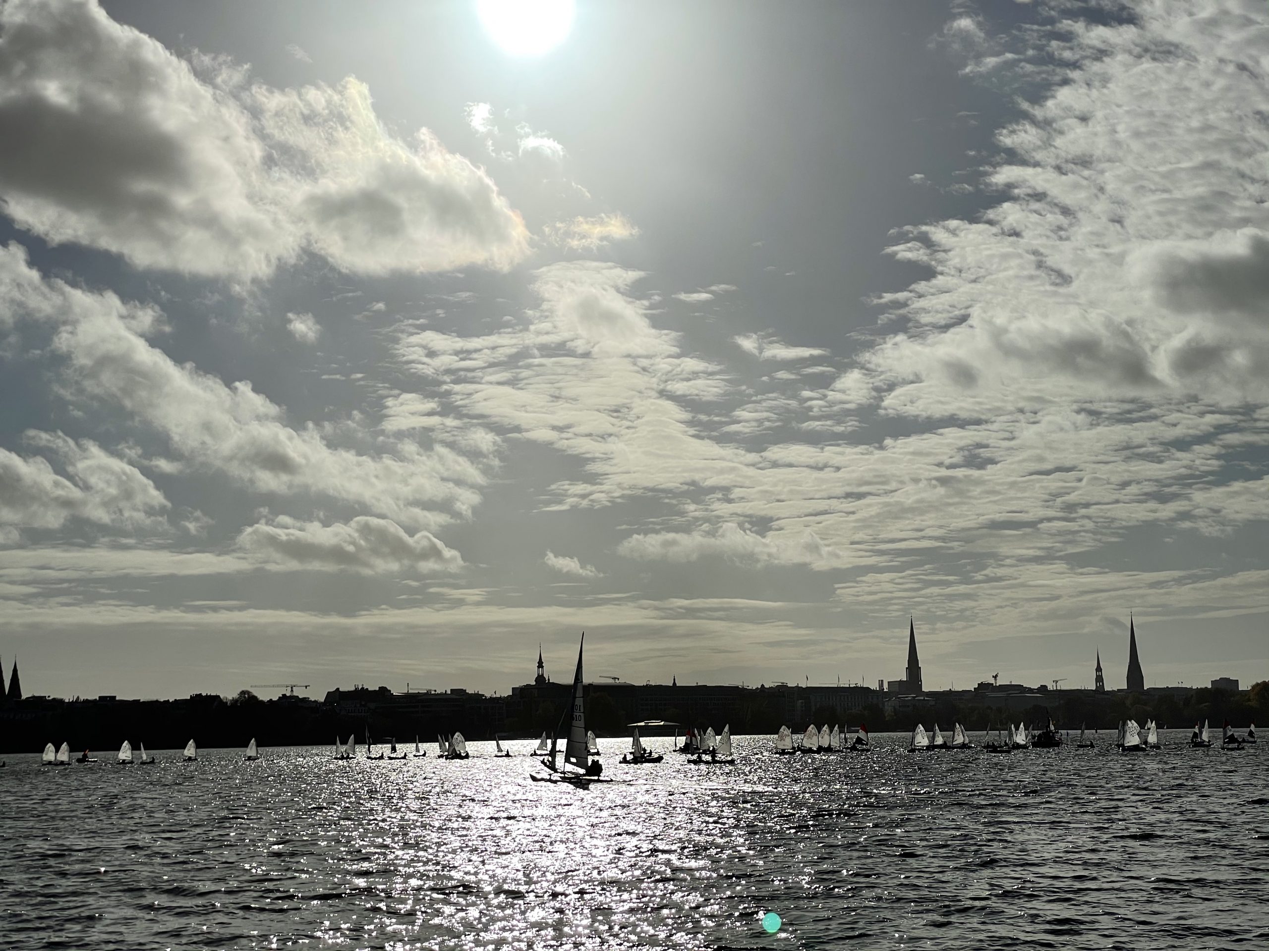 Am Sonntag startete der Wind ähnlich schwach aber mit bestem Sonnenschein! Der Regen hat uns trotz aller gegenteiligen Vorhersagen verschont! Der ab Mittag zunehmende Wind erlaubte auch am Sonntag 4 Wettfahrten, so dass nicht nur die Leichtwindspezialisten auf ihre Kosten kamen. Dem entsprechend wurden die Ergebnisliste auch noch etwas durchgerührt. Am Ende blickten alle Segler auf zwei schöne Segel-Tage an der Alster.