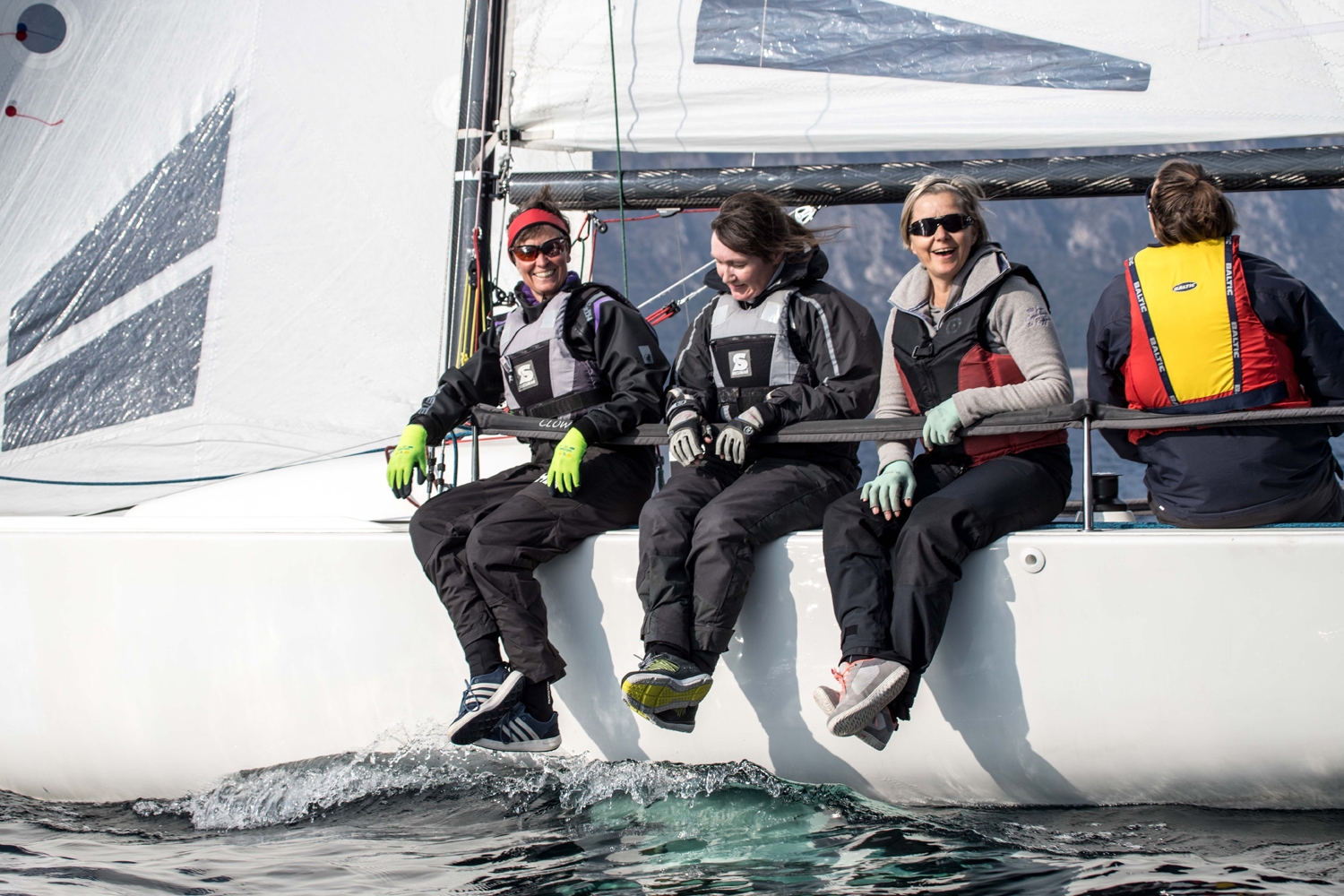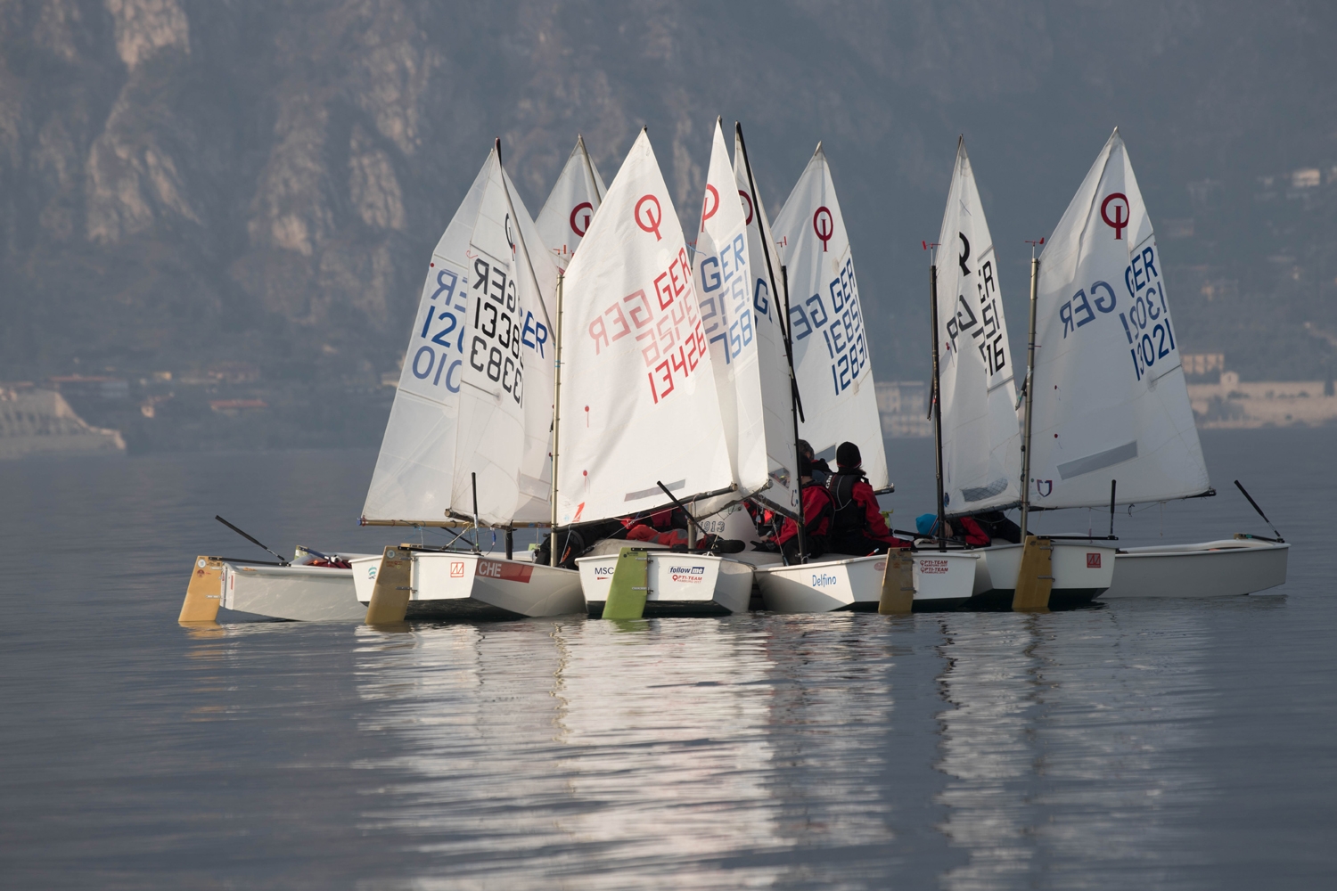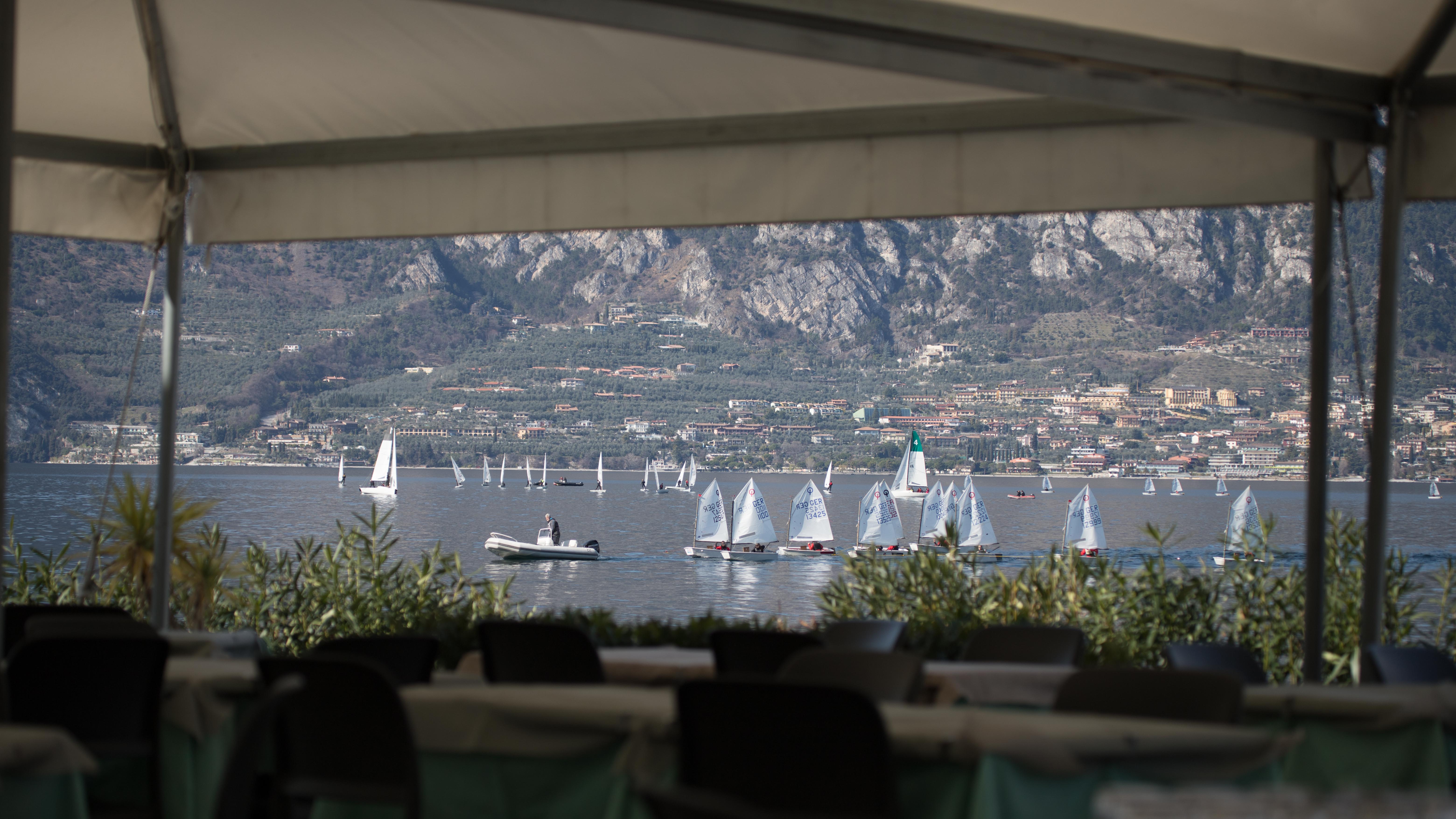 Am nächsten Morgen geht es zu Füßen des 2.218 Meter hohen Monte Baldo, der über den Seglerort Malcesine emporragt, wieder los. Immer der hoffentlich wieder erwachten Sonne entgegen, die auf der Ostseite des Sees, über den für eine Spritztour zur Eisdiele bekannten Ort Limone, aufgeht. Ab 10.15 Uhr setzt das Licht der Sonne die Bergkulisse perfekt in Szene und wärmt die kleinen und großen Segler. Das Motto der ersten Wochenhälfte: Raum! Statt Alaaf und Helau, dieses Jahr verkleiden wir uns alle als Segler.