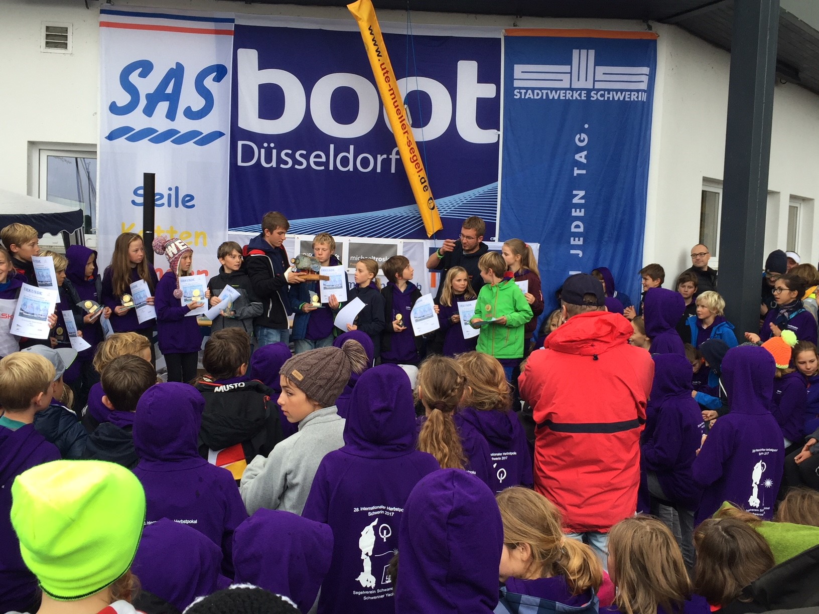 Die Segel mussten wir wieder abbauen und dann hieß es für fast alle wieder: ab in die Unterkünfte. Der zweite Segeltag brachte ein bisschen mehr Wind mit und As und Bs segelten je zwei Wettfahrten. Die Siegerehrung dauerte am Ende etwas länger, da jede Menge Sachen und ein Segel verlost wurden. Es fing leicht an zu nieseln, manche fuhren schon vor der Siegerehrung Richtung Gardasee, alle anderen nach Hause. Insgesamt war es eine sehr gelungene Regatta.