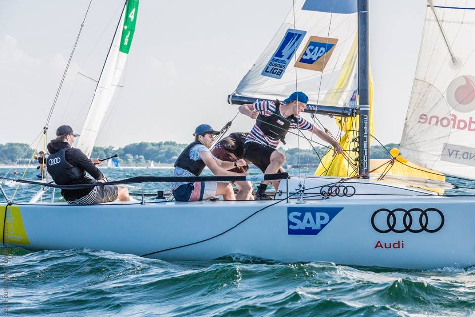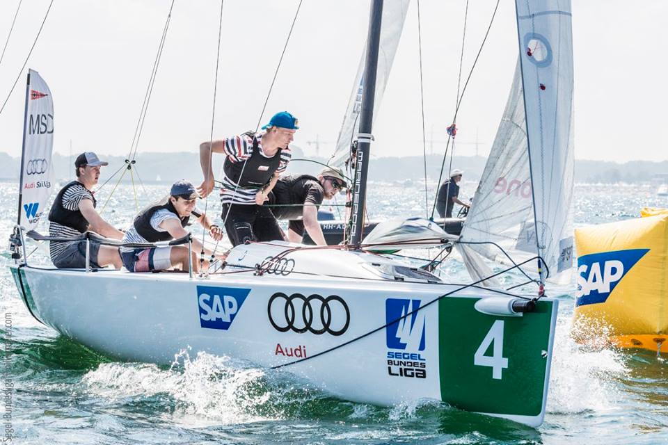 Mit viel Spannung wurde der dritte Spieltag der Segel- Bundesliga in Travemünde erwartet. Nachdem die MSC Youngster Magnus Simon, Till Krüger, Finn Olsen und Simon Zweigler in Starnberg ganz oben auf dem Treppchen landeten, stand nun ihr zweiter Auftritt im Bundesligazirkus an. Der Start in die Serie hätte allerdings schlechter nicht laufen können – drei Strafpunkte standen zu Buche und zu allem Überfluss wurde das erste Rennen mit einem sechsten Platz beendet. Das war im Gesamtklassement dann erstmal abgeschlagen der letzte Platz. Doch die Jungs ließen sich nicht unterkriegen und begannen eine fulminante Aufholjagd – eine Serie mit zwei zweiten und zwei ersten Plätzen folgte. Dann leider noch ein fünfter Platz. Wer die Liga verfolgt hat, weiß wie knapp am Ende die Ergebnisse sind – da zählt wirklich jeder Punkt und jeder Meter. Ab Sonntag vormittag ließen die vier allerdings nichts mehr anbrennen und segelten nur noch erste Plätze – Chapeau! Damit waren sie am Sonntag abend bis auf Gesamtplatz 2 geklettert; der Rückstand zum Führenden nur 2 Punkte.
