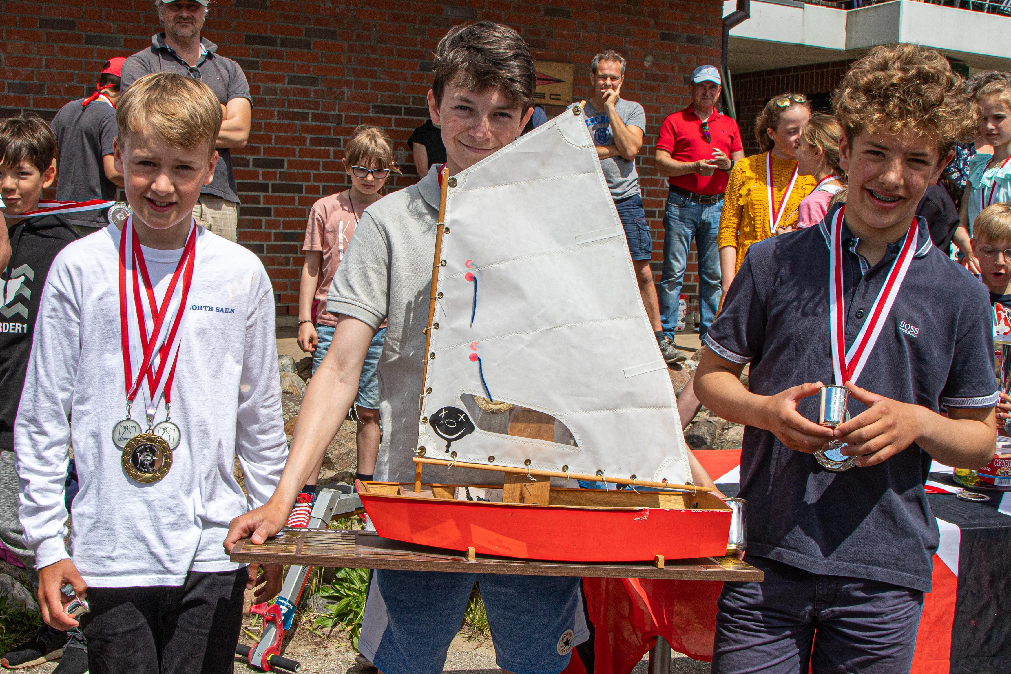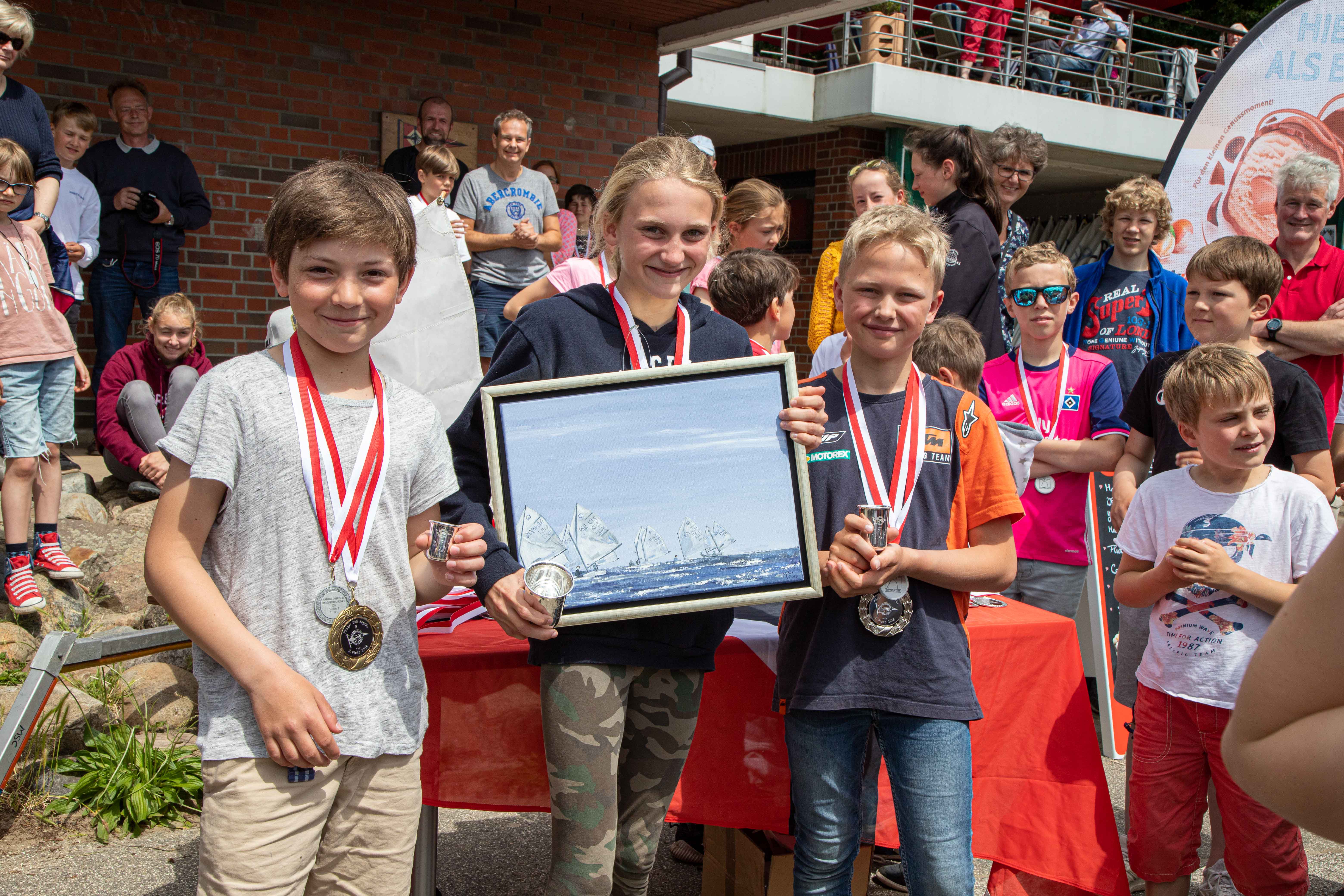 Um am Sonntag das ausstehende Regattaprogramm im Gezeitenfenster schaffen zu können, hieß es wieder früh aufzustehen. Bei besten Segelbedingungen konnten die ausstehenden Wettfahrten (2 bei den A’s und 3 bei den B’s) gesegelt werden. Überraschend, dass beide späteren Sieger ihre bis dahin makellose Bilanz in der lezten Wettfahrt nicht fortsetzen konnte. Aber auf das Ergbnis hatte das keinen Einfluss mehr. In B gewann Maya vor Tristen und Franz, in A Casper vor Willy und Theo. Den Pokal des Gesamtjüngsten konnte Johann mit nach Hause nehmen. Das Paddel für den jüngsten A-Segler bei der Hamburger Meisterschaft steht nun ein weiteres Jahr bei Rasmus. Herzlichen Glückwunsch.