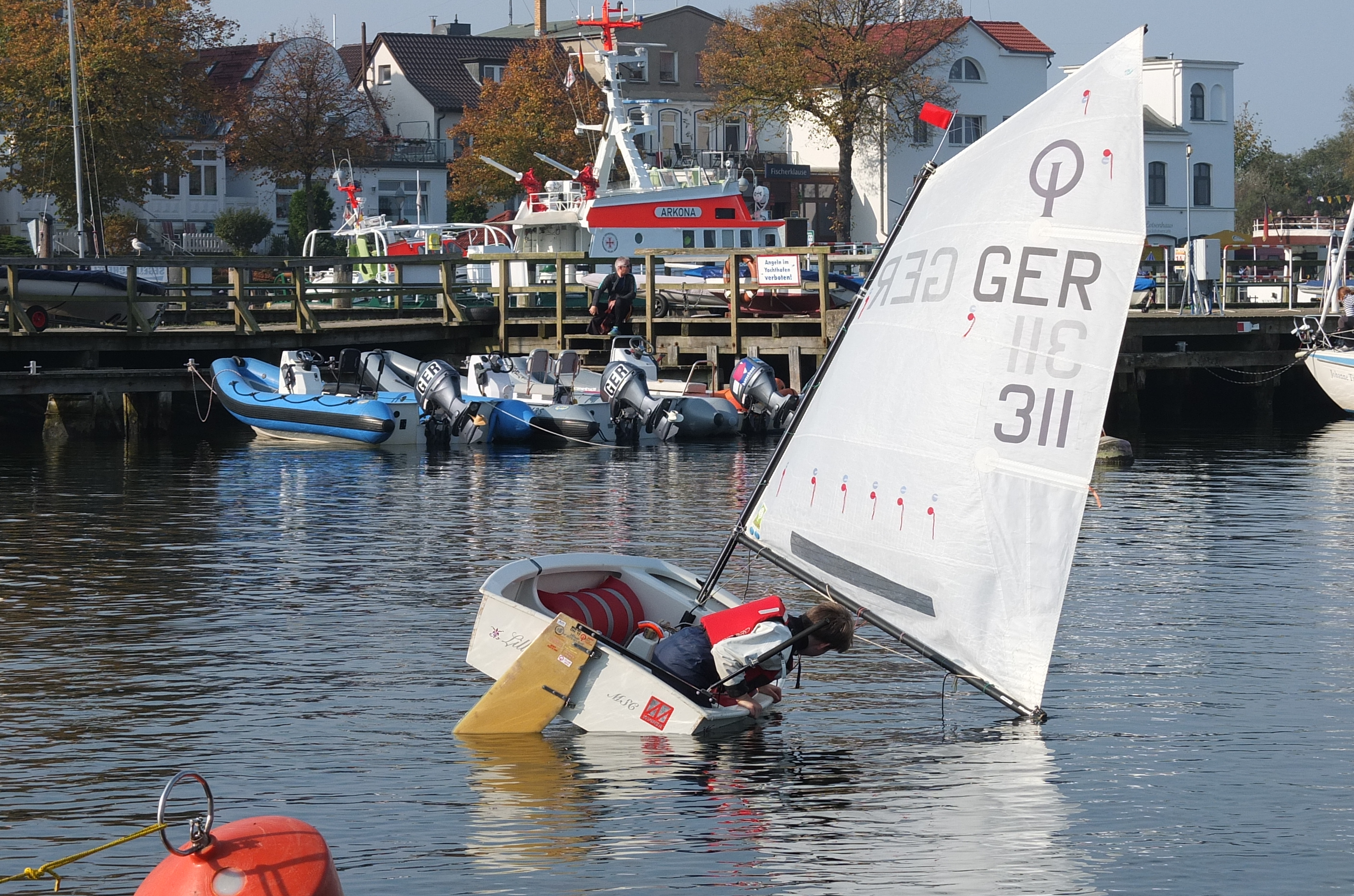Auch wenn die frühe sonntägliche Anreise noch Erinnerungen an das letzte Nebel-Jahr aufkommen ließ, wurden dann alle mit zunehmenden Sonnenschein und frühlingshaften Temperaturen begrüßt. Wer sich im Oktober an der Ostsee zum Segeln einbucht, denkt in erster Linie an viele warme Sachen, aber sicher nicht an Sonnencreme und kurze Hosen, auch wenn man diese in diesem Jahr hier und da sichten konnte.