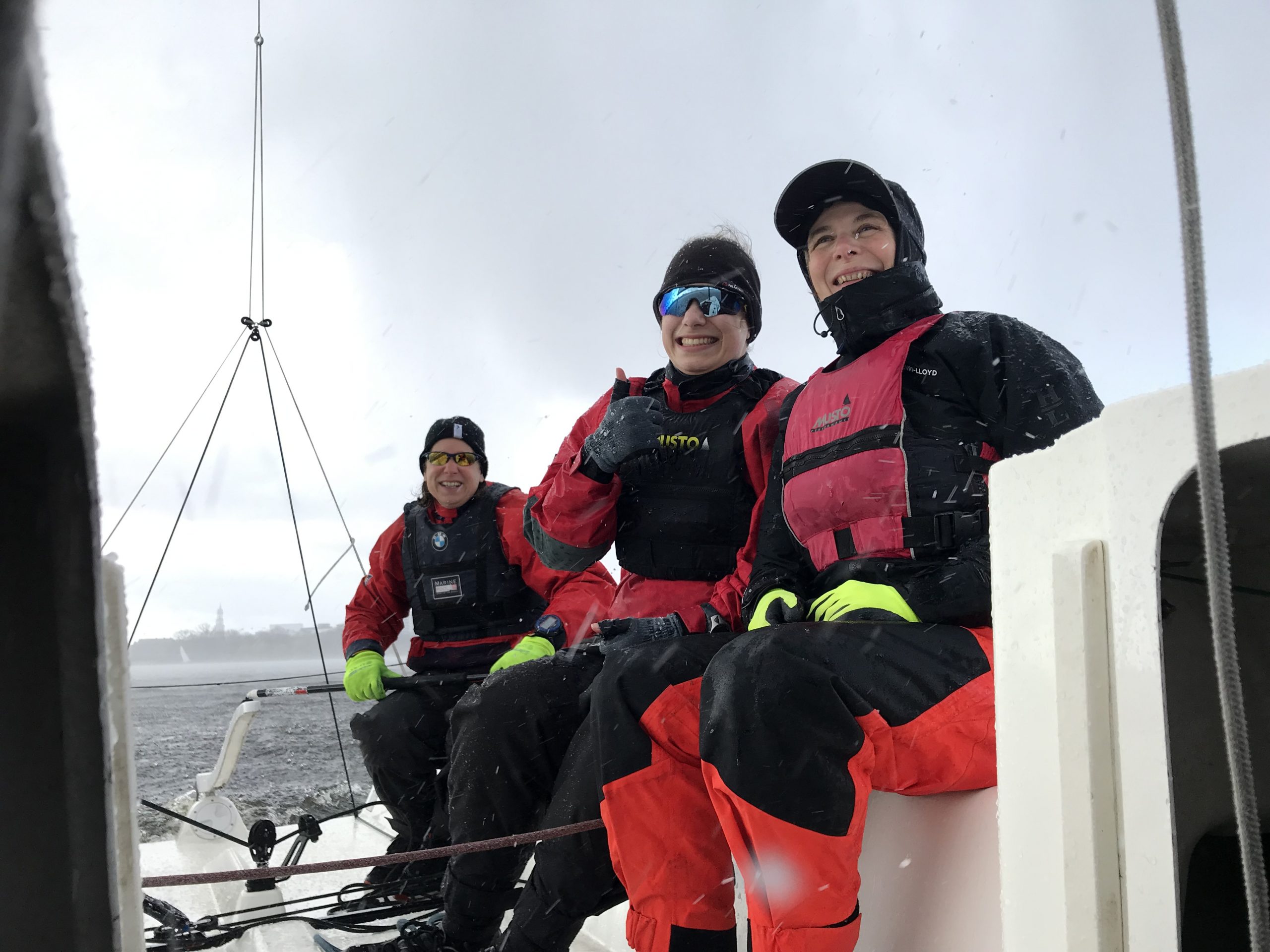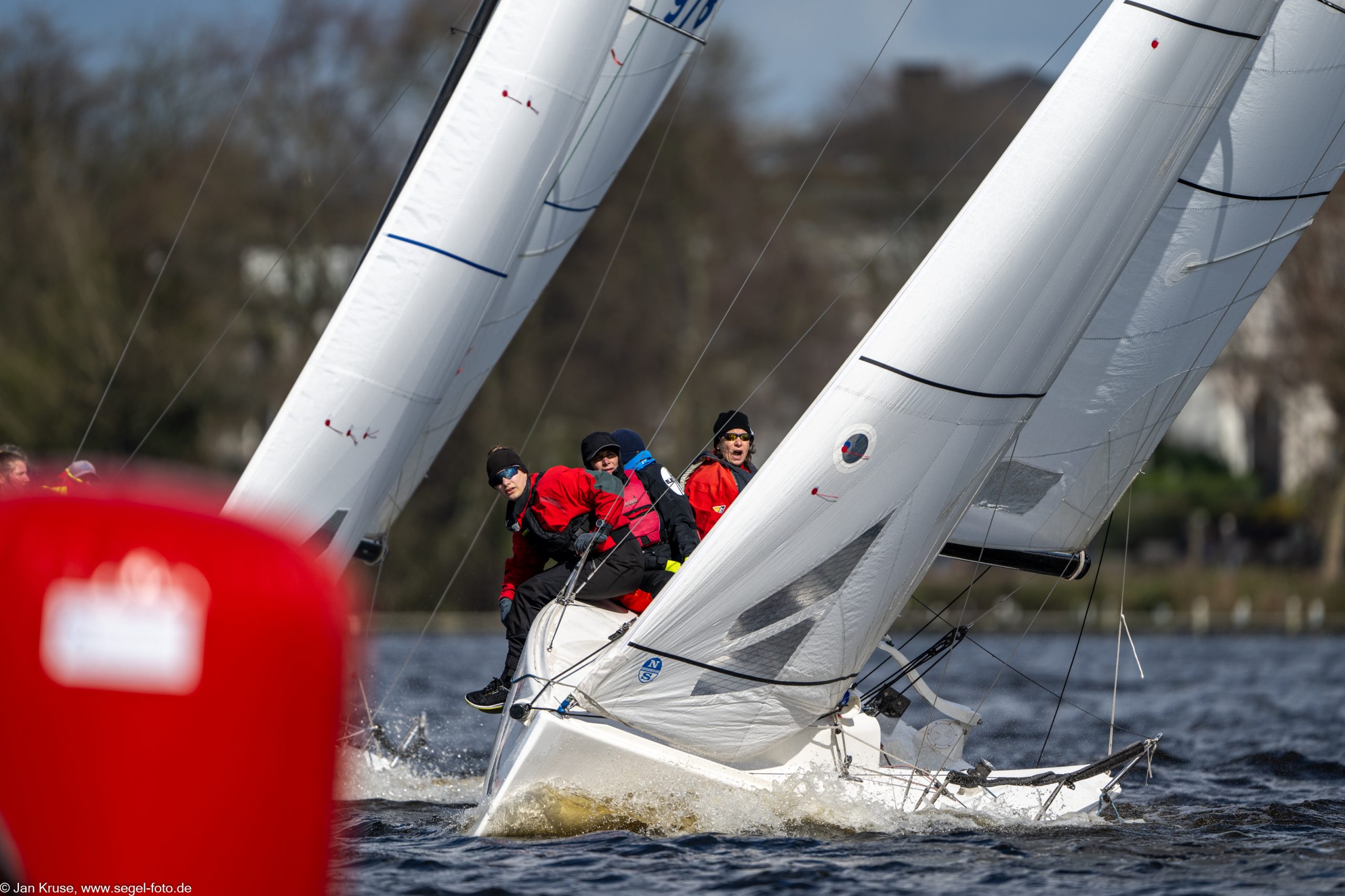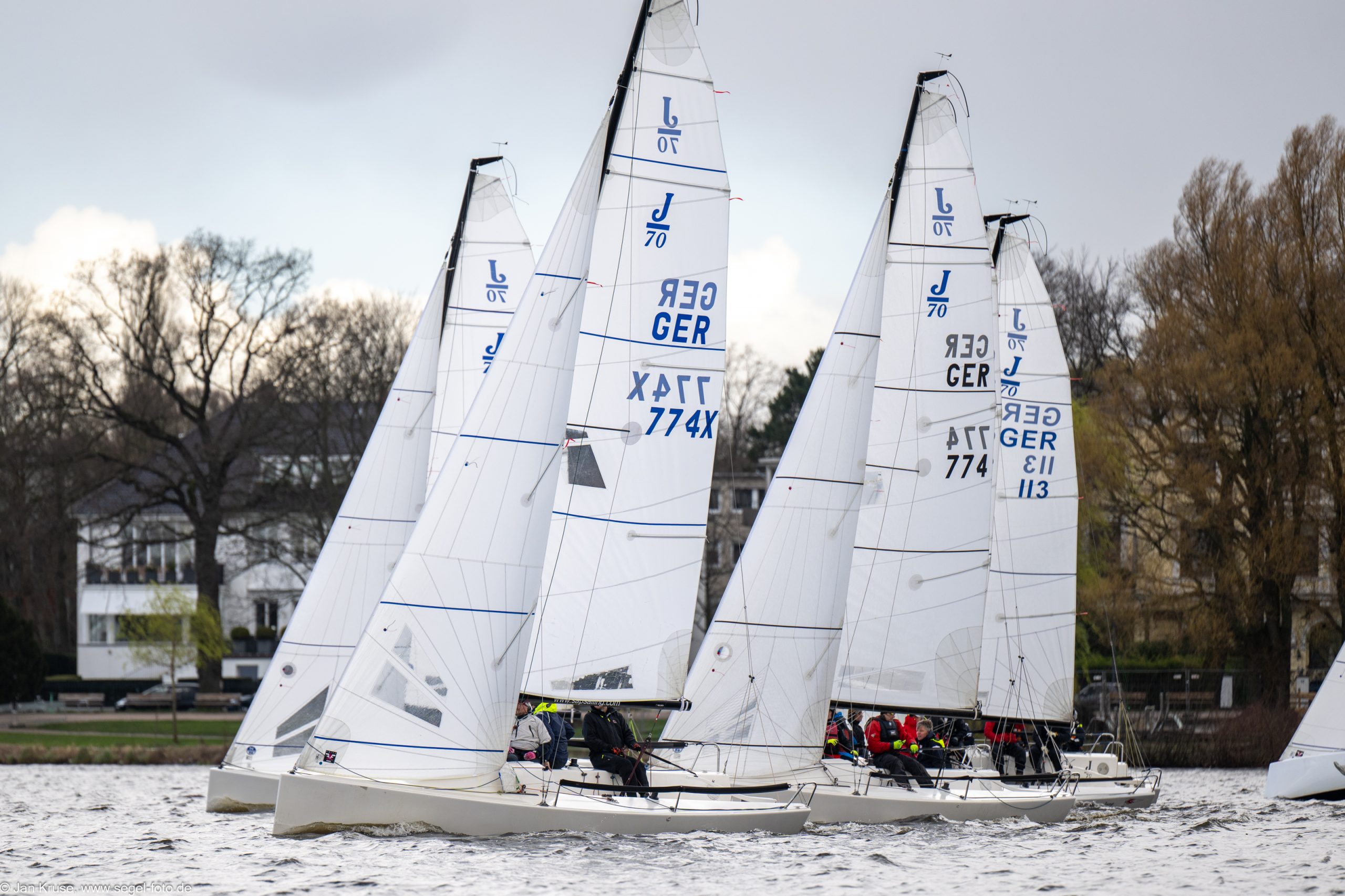 Aber nein, unser Saisonstart war alles andere als warm, trocken und entspannt. Der NRV hat Ende März die Regattasaison mit einer J/70 Regatta auf der Alster eröffnet. Vom MSC war auch noch Till mit seinem Team von der Partie. Je näher der Event rückte, umso höher wurden die angesagten Windgeschwindigkeiten und die Temperatur sank weiter deutlich. Der Gipfel war dann tatsächlich, als wir am Samstag den Graupel kurz vor dem Start mit Ösfass aus dem Cockpitt schaufeln mussten, wer braucht auch schon mehr als 5 Grad beim Segeln. Aber das alles hat dem Spaß nicht eintrüben können. Wir haben an dem Wochenenden insgesamt 16 !!! Rennen á ca.15 min. gesegelt. Da war keine Zeit zum großartigen Frieren. Die Rennen waren sehr spannend. Es gab alles, viele Dreher, ordentliche Drücker, aufregende Tonnensituationen, Frühstarts, Black Flag Starts, enge Startsituationen und auf Grund der vielen Liga Teams blieb die Anspannung die ganze Zeit auch hoch. Insgesamt sind wir 6. von 11 geworden und damit sehr zufrieden. So kaputt nach einem Regatta Wochenende waren wir alle lange nicht mehr. Der Sportplan steht. Einen besseren Saisonstart hätten wir uns nicht vorstellen können.