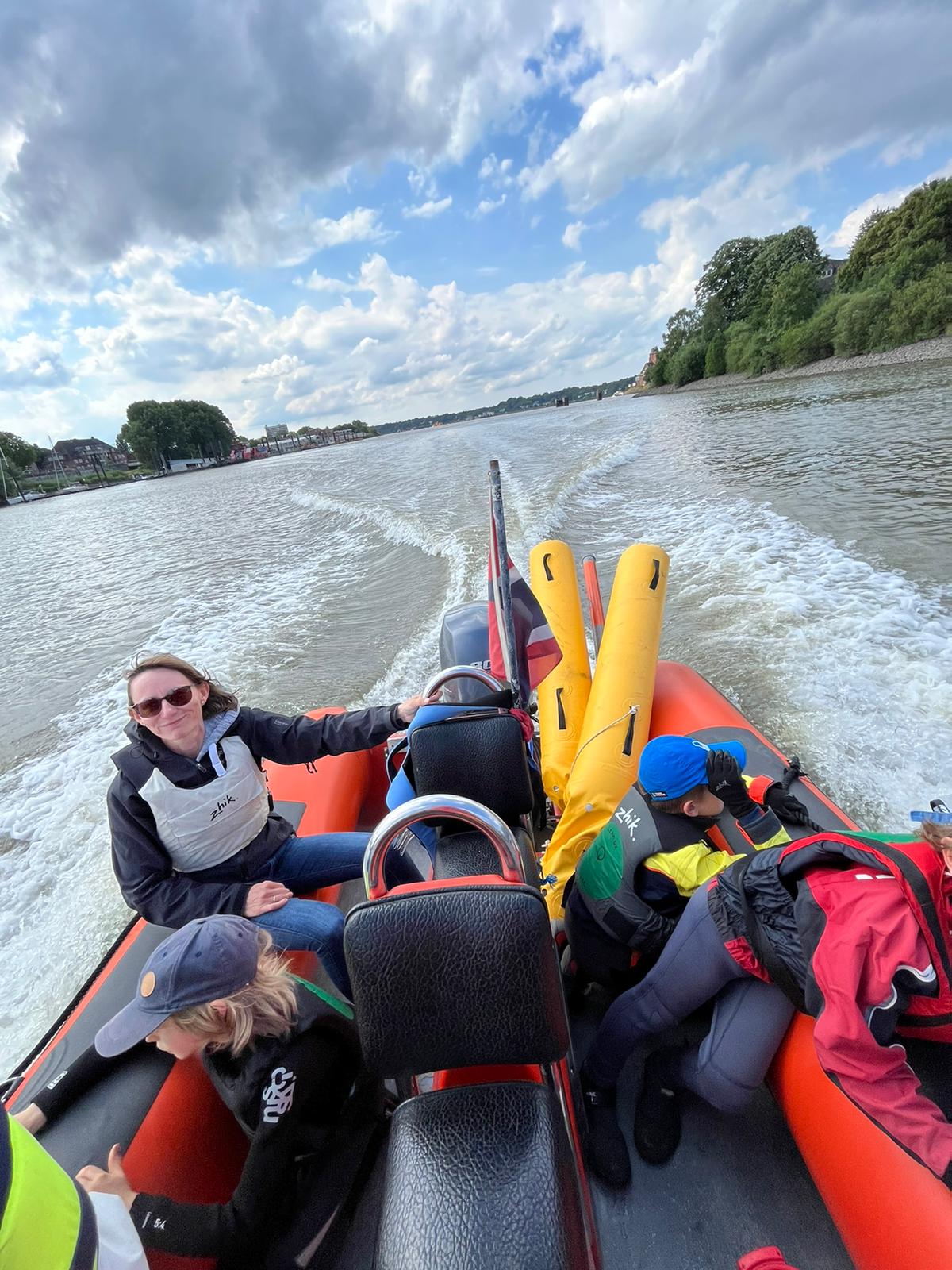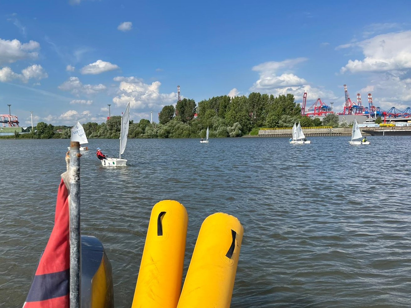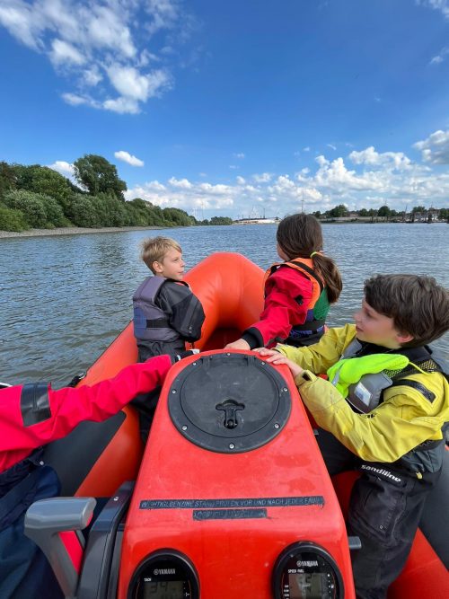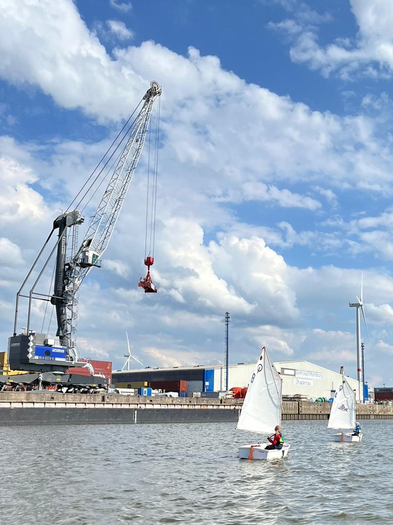 Am letzten Montag haben wir das Segeln auf dem Köhlfleet mit der Anfängergruppe von Dani und Sandra zum ersten Mal ausprobiert. Um 16 Uhr sind wir mit 8 Kindern beim MSC gestartet. Per Motorboot ging es – auf Wunsch der Kinder natürlich mit Vollgas – rüber zum Köhlfleet. Dort angekommen wurde sich kurz mit den Booten vertraut gemacht und dann konnte es auch direkt losgehen. Kurz ins Wasser schieben stellte sich zwar etwas schwieriger da als gedacht, weil die IMMAC-Optis für die größtenteils noch recht schmächtigen Anfängerkinder ziemlich schwer sind, aber mit etwas Unterstützung seitens der Trainer haben es alle geschafft! Bei tollen Bedingungen konnte zwischen Kaimauern, Containern und Hafenkränen gesegelt werden. Den Kindern hat es super viel Spaß gemacht! Und auf dem Rückweg gab es sogar noch ein Sommerferienanfangseis in Finkenwerder. Es war ein toller letzter Trainingstag vor den Ferien!